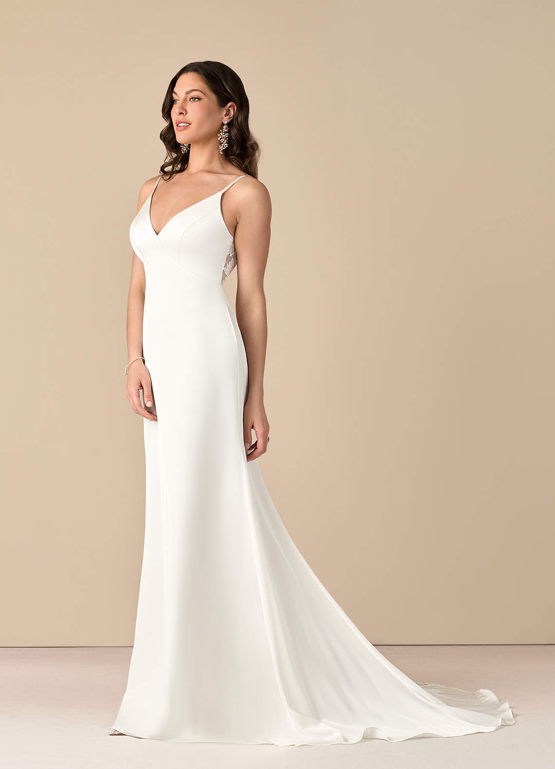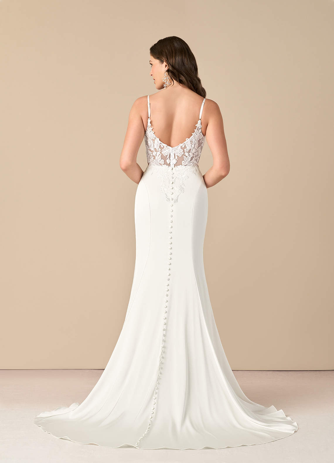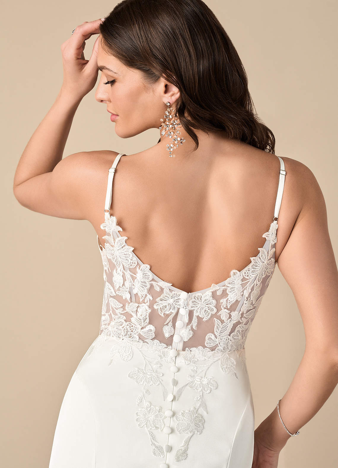 Adana is our stunning bridal gown cut from stretch satin and lace applique. She features a V-neckline with spaghetti straps, leading to an illusion V-back. The look is complete with a mermaid chapel length skirt with cover buttons down the train.