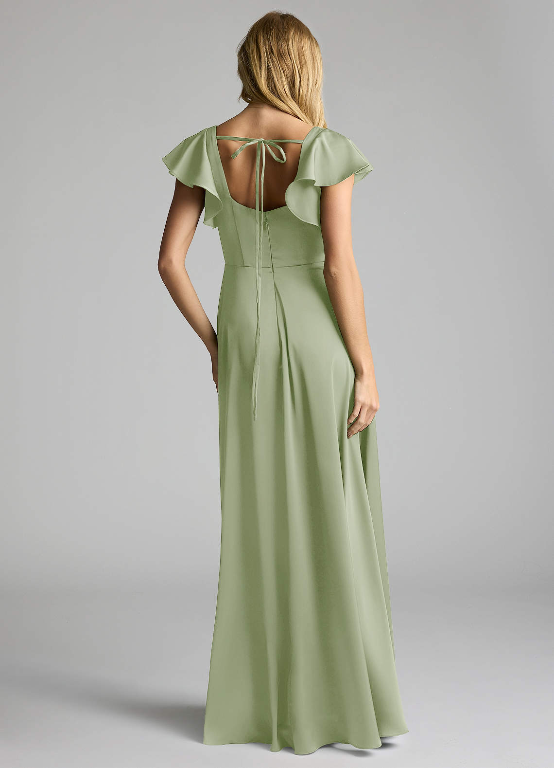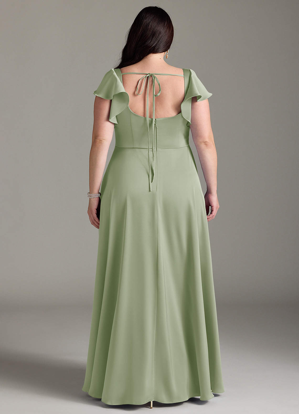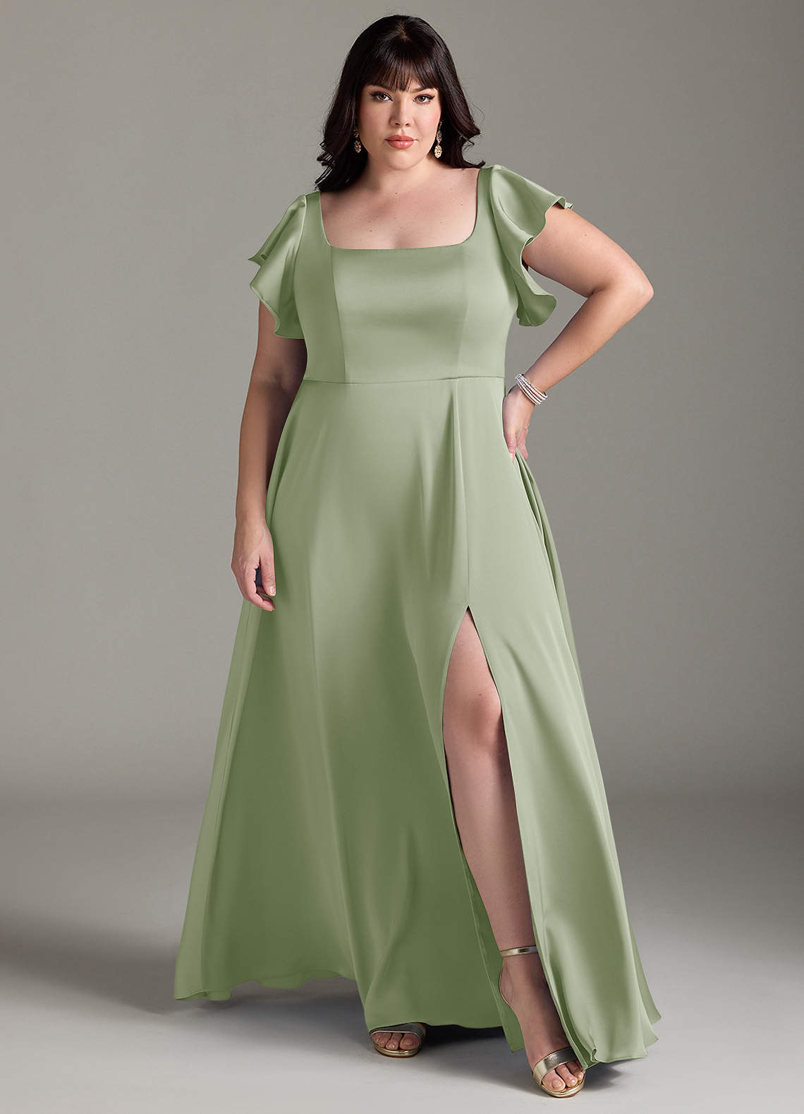 Bondi is our gorgeous bridesmaid dress cut from stretch satin. She features a square neckline with flutter sleeves and a self tie scoop back. The look is complete with an A-line skirt paired with a leg slit.