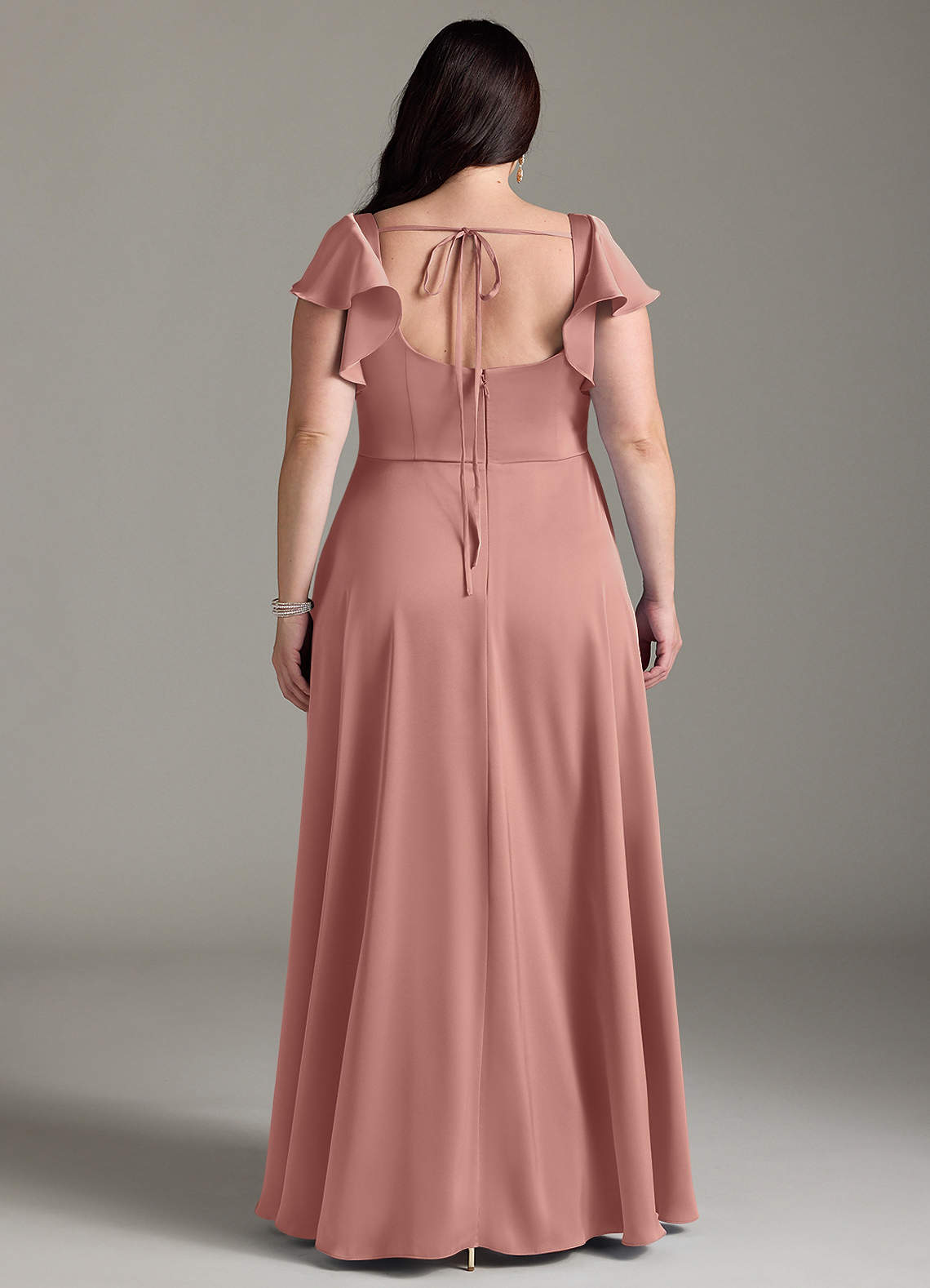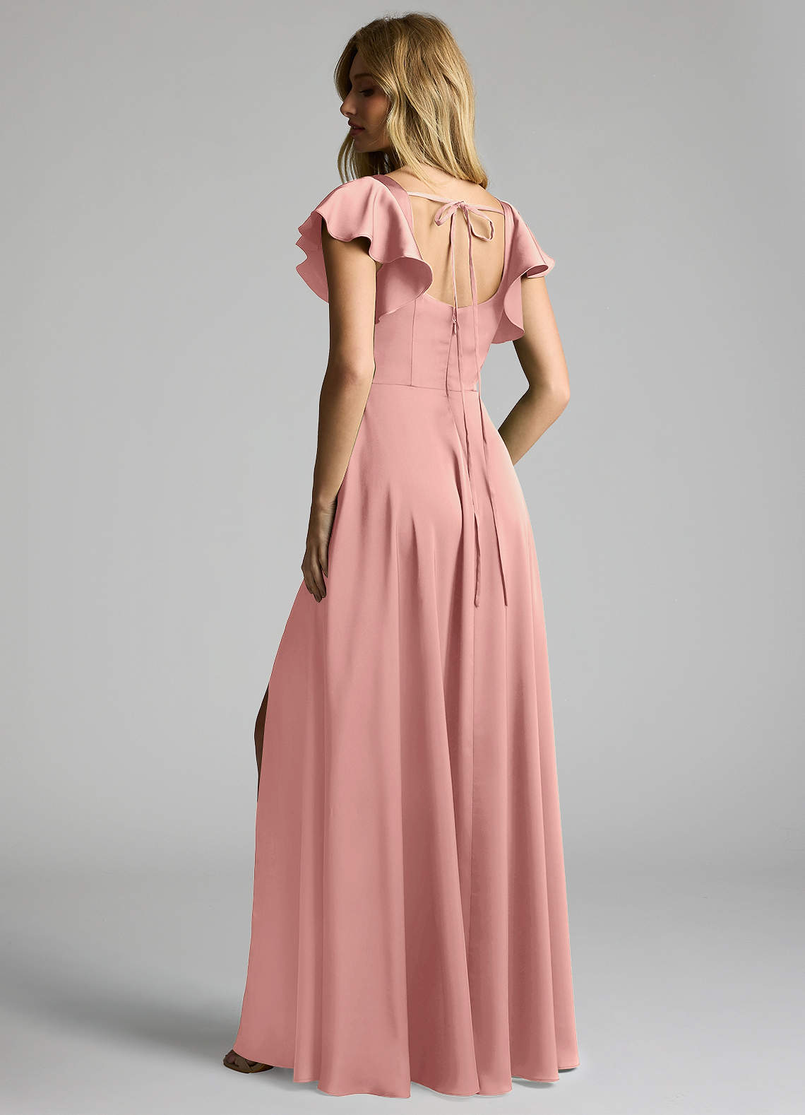 Bondi is our gorgeous bridesmaid dress cut from stretch satin. She features a square neckline with flutter sleeves and a self tie scoop back. The look is complete with an A-line skirt paired with a leg slit.