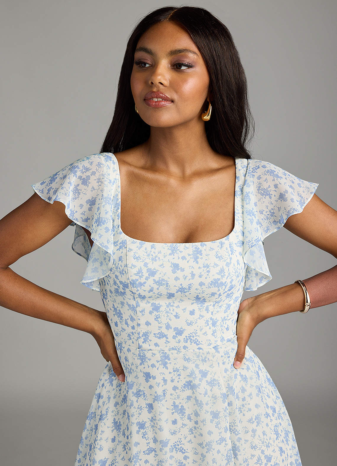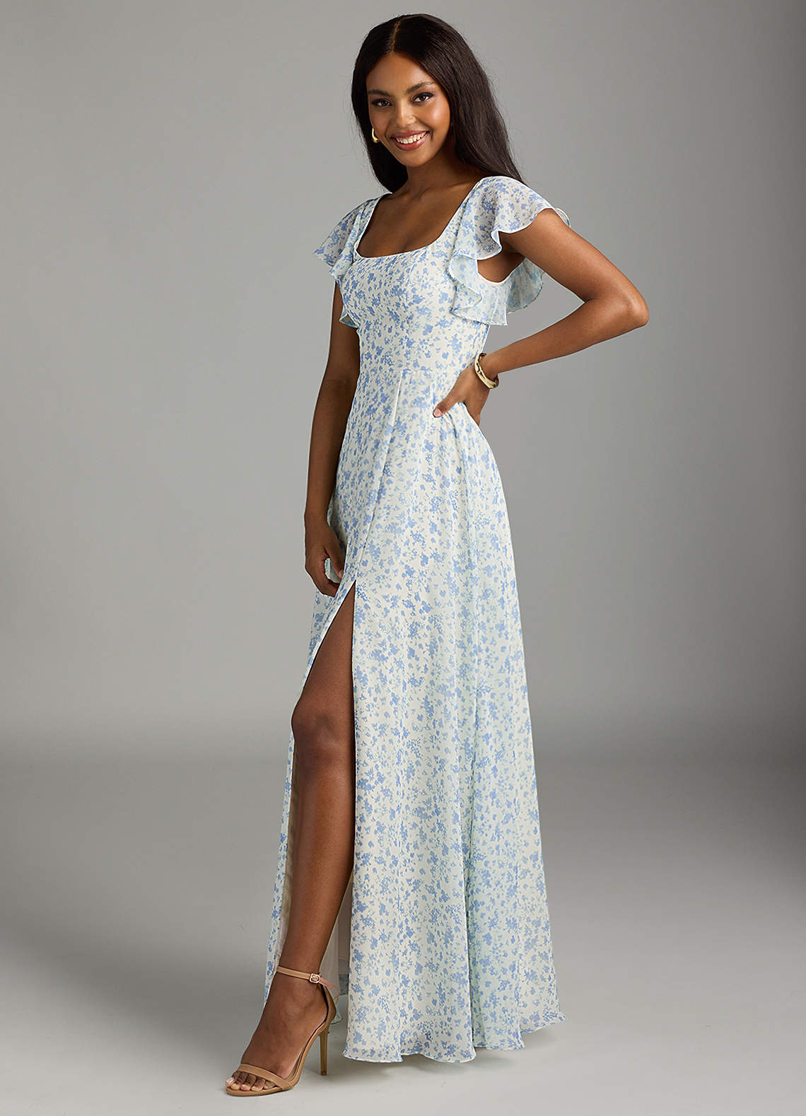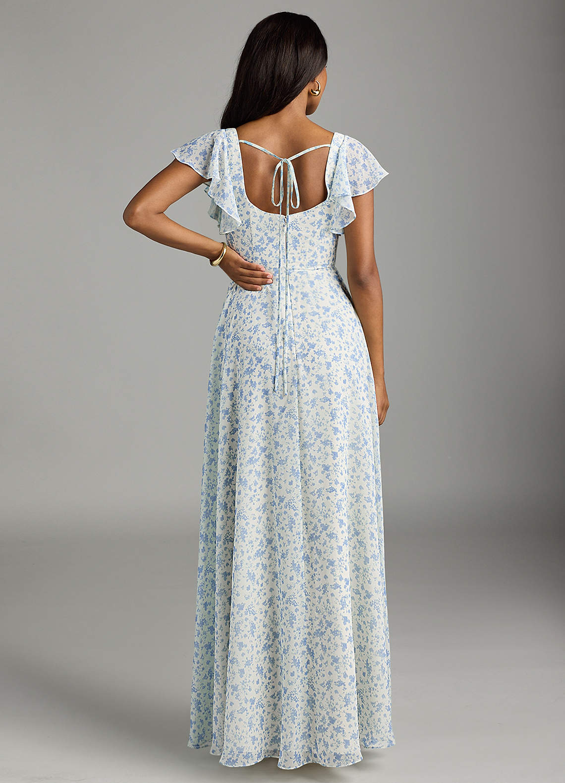 Bondi is our gorgeous bridesmaid dress cut from chiffon. She features a square neckline with flutter sleeves and a self tie scoop back. The look is complete with an A-line skirt paired with a leg slit.