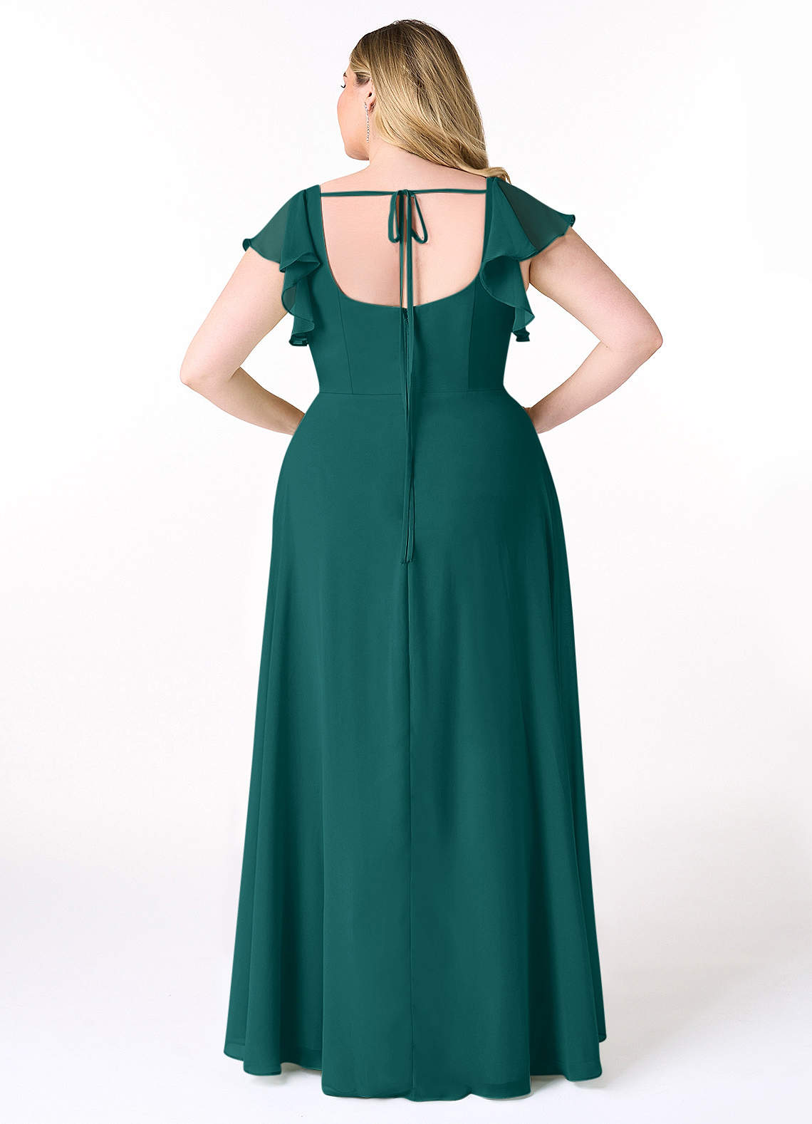 Bondi is our gorgeous bridesmaid dress cut from chiffon. She features a square neckline with flutter sleeves and a self tie scoop back. The look is complete with an A-line skirt paired with a leg slit.