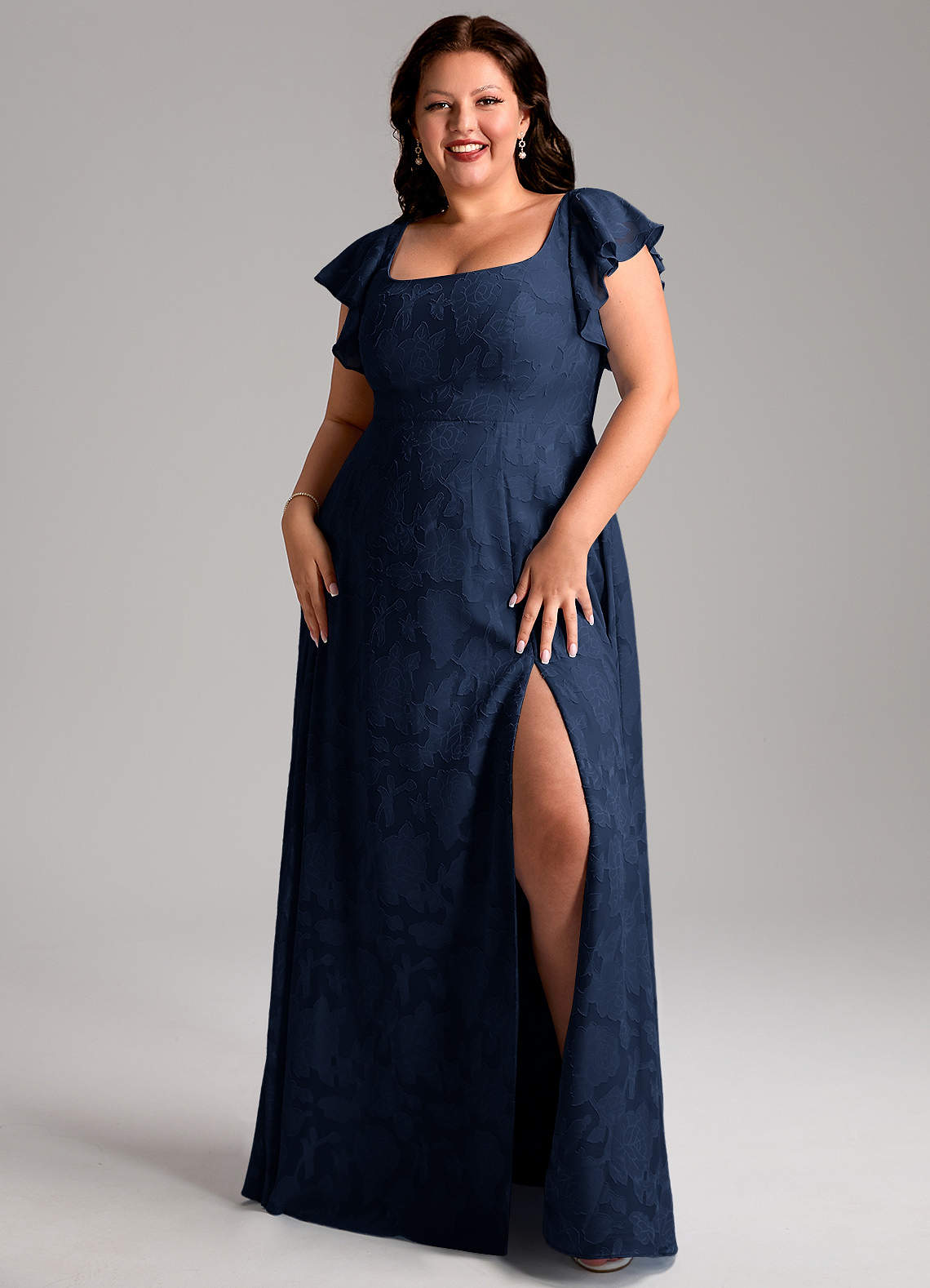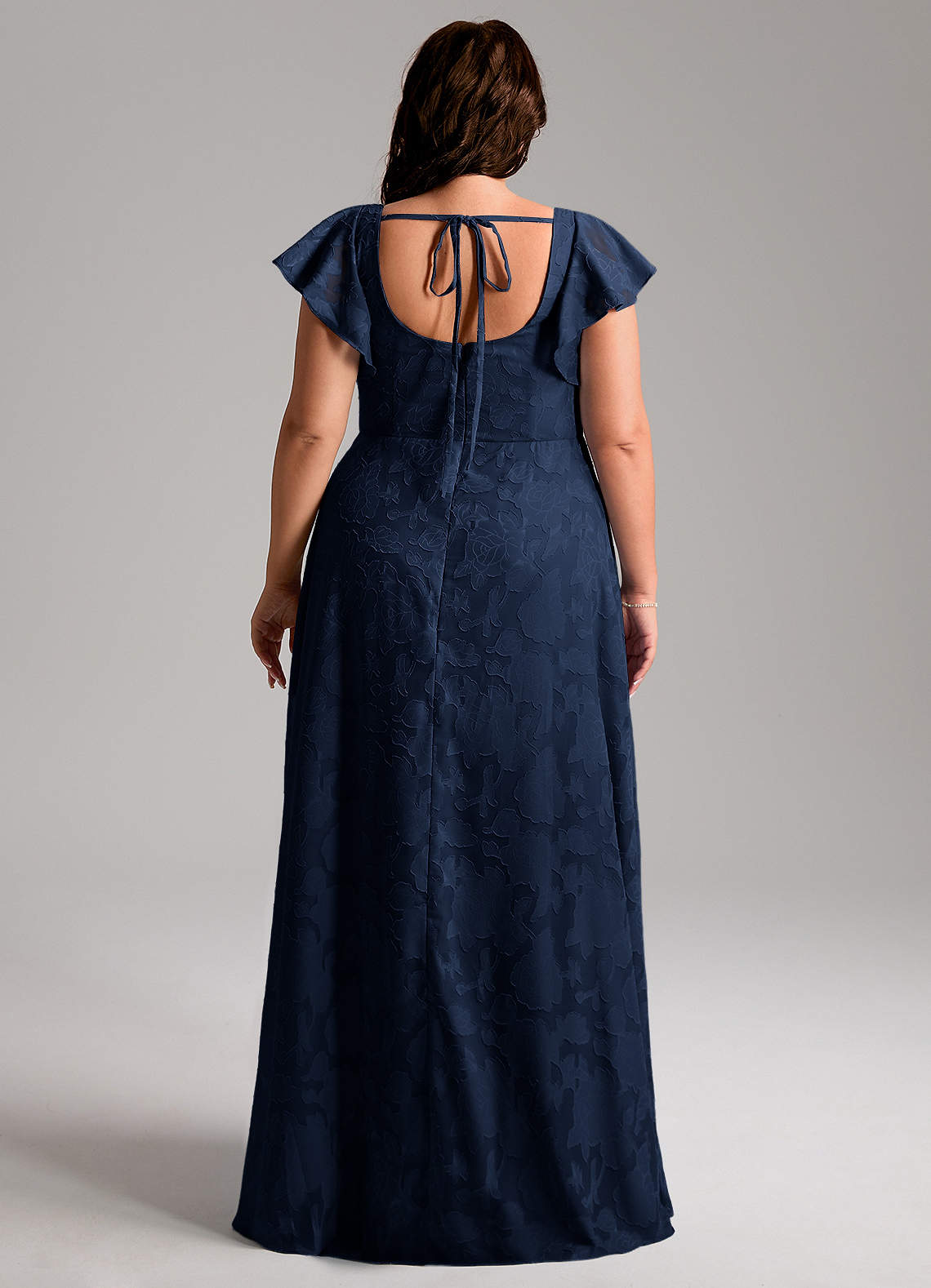 Bondi is our gorgeous bridesmaid dress cut from our floral burnout fabric. She features a square neckline with flutter sleeves and a self tie scoop back. The look is complete with an A-line skirt paired with a leg slit.