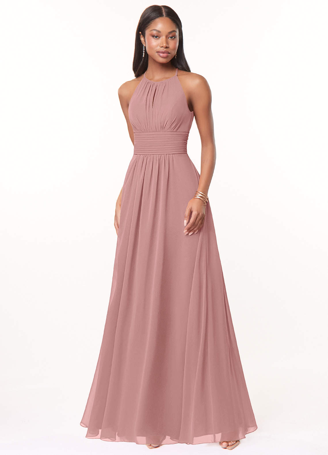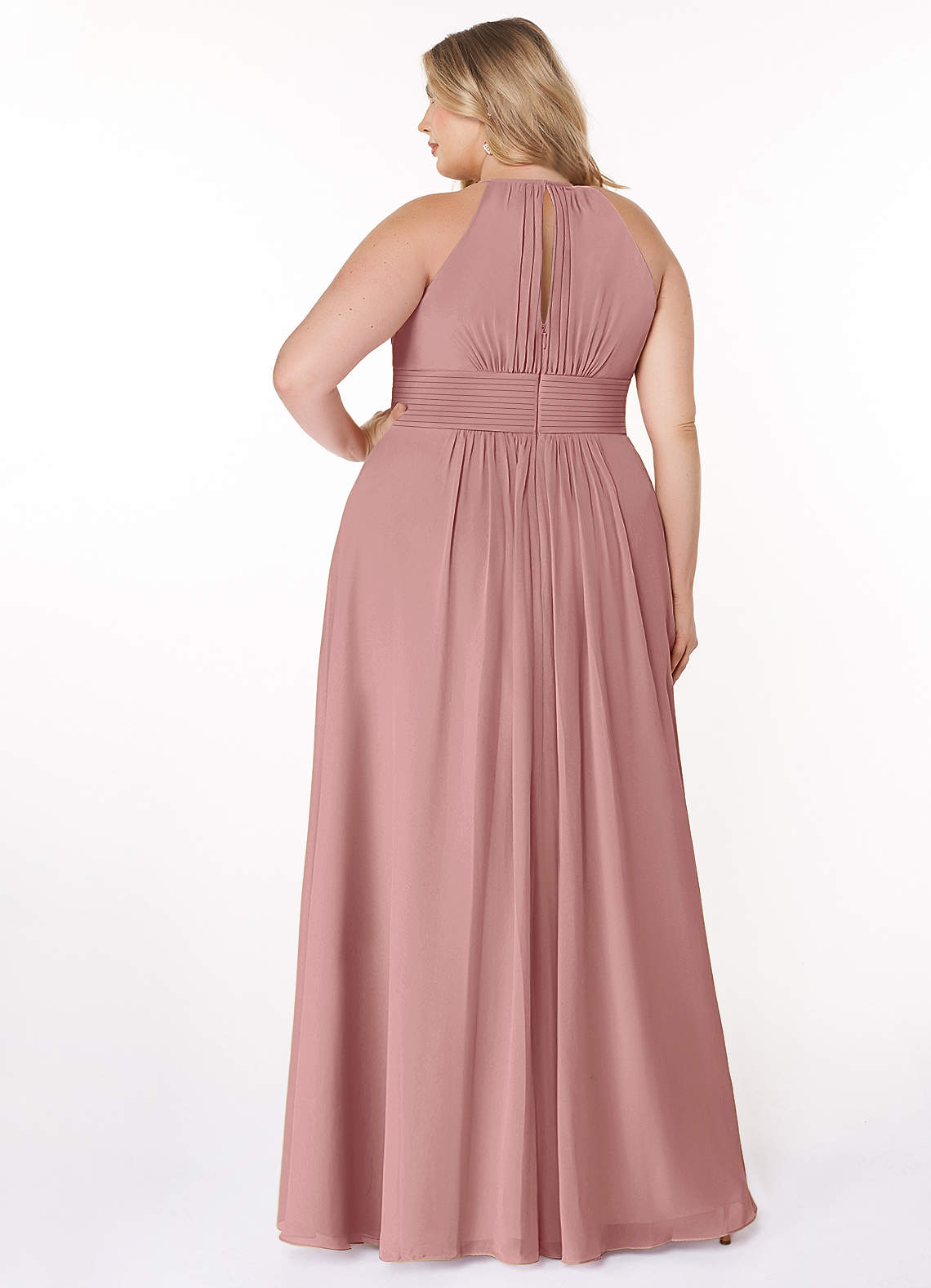 Bonnie is a floor-length chiffon bridesmaid dress in an A-line cut. Bonnie features a halter neckline with a unique key-hole back. This bridesmaid dress is available in full size range (A0-A30) and custom sizing.