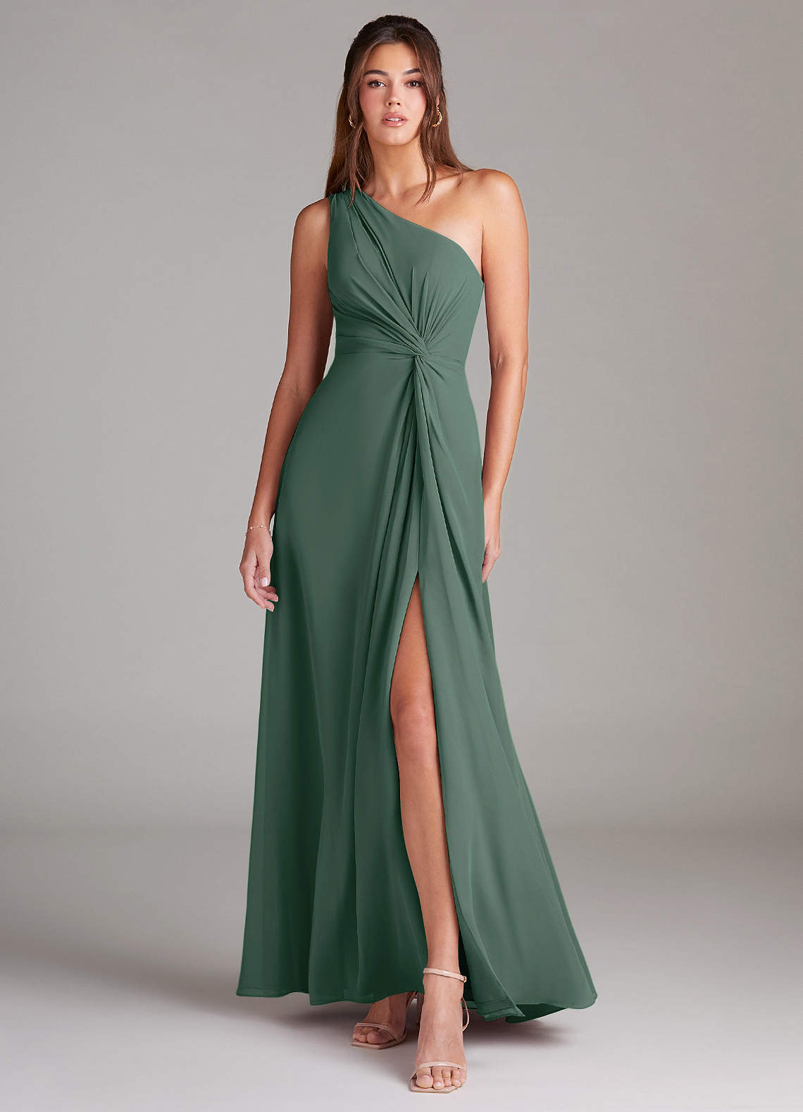 Look like a modern day Greek goddess wearing Brooke. This one-shoulder bridesmaid dress is made of a flattering chiffon, giving your bridesmaids a look of modern elegance. Her bodice pleating and side waist knot accentuate the waistline, and a side leg slit adds an alluring touch to her classic A-line skirt.