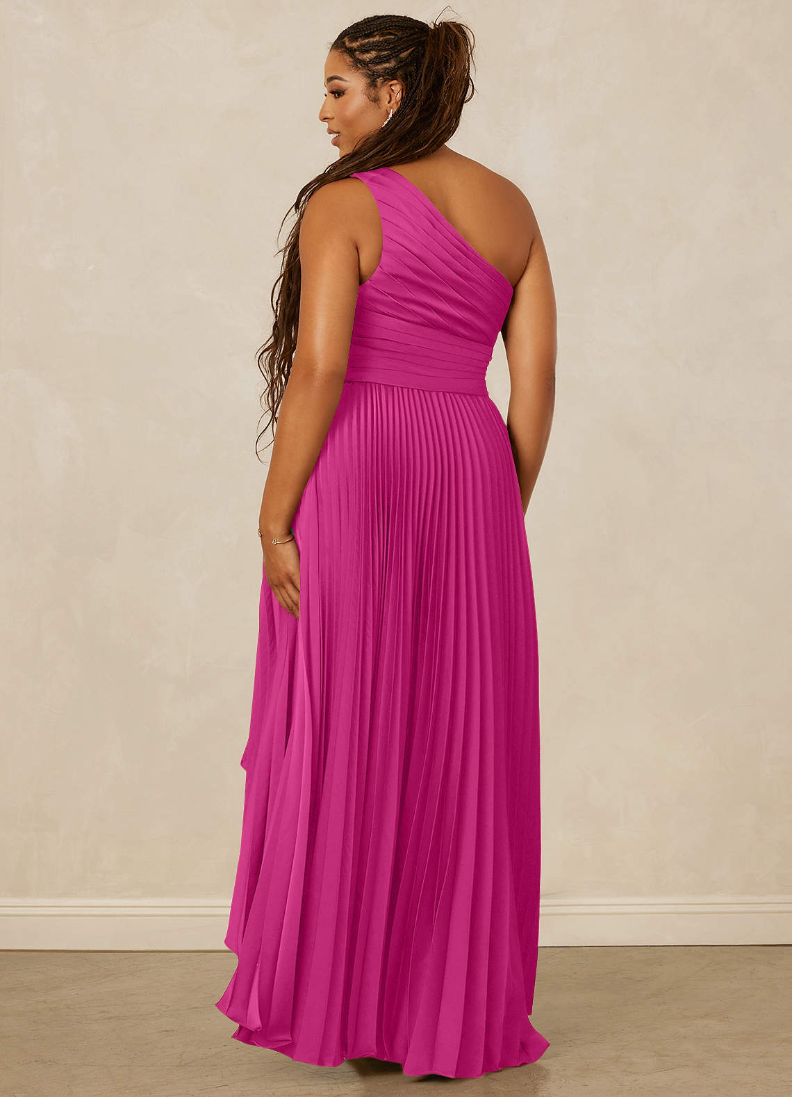 This high low length dress features a one-shoulder neckline, a hand pleated waistband, and an overlapping skirt.