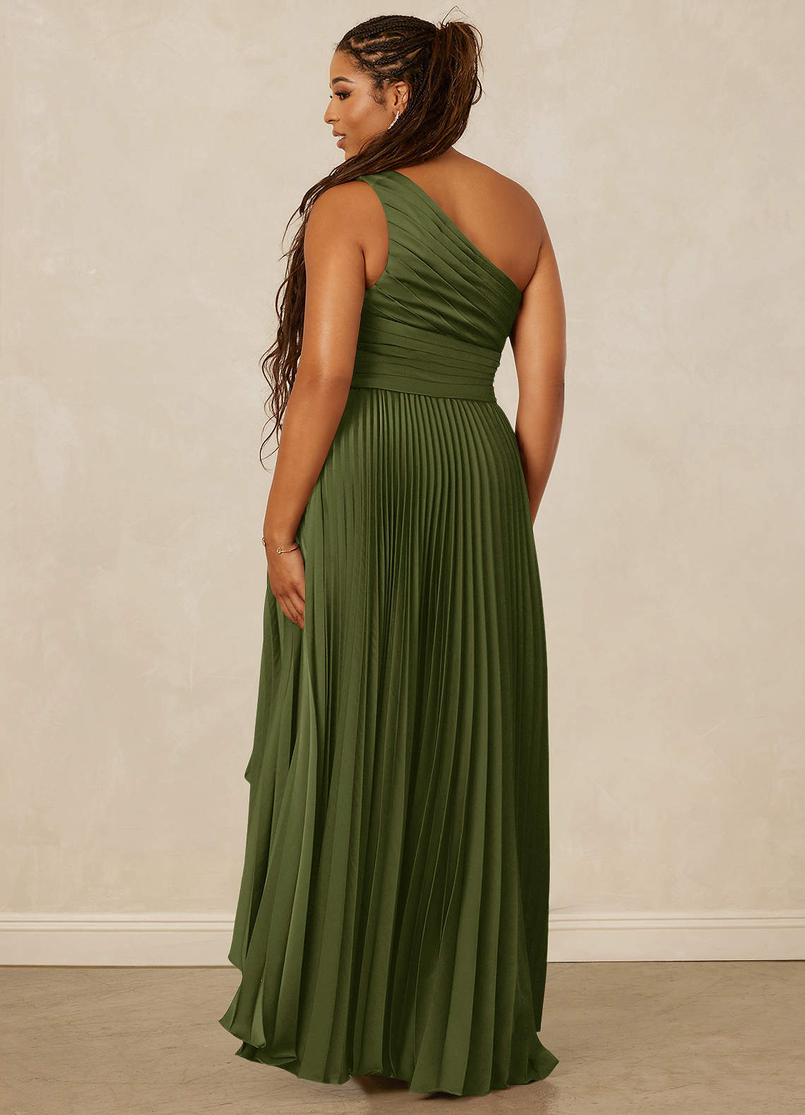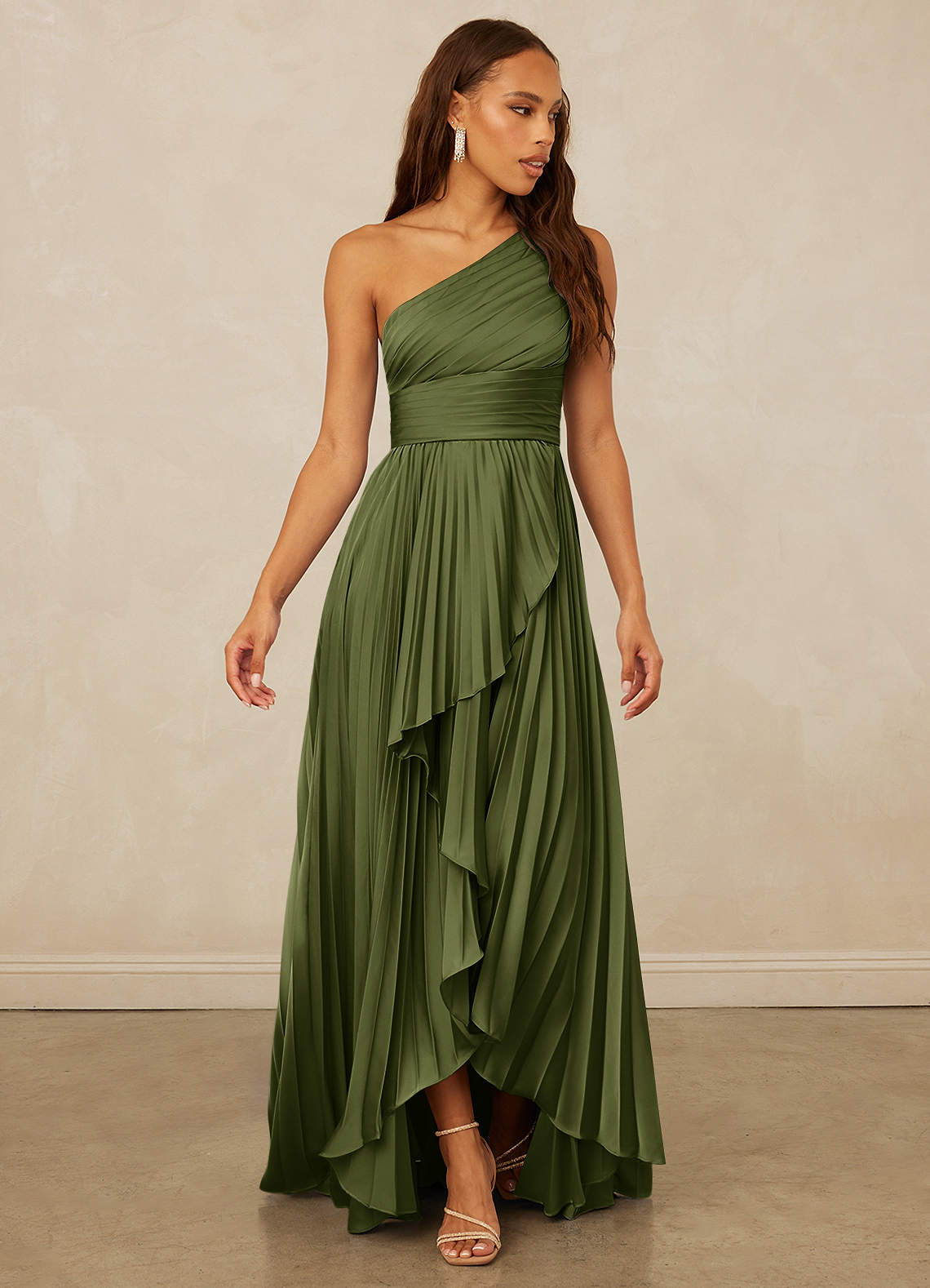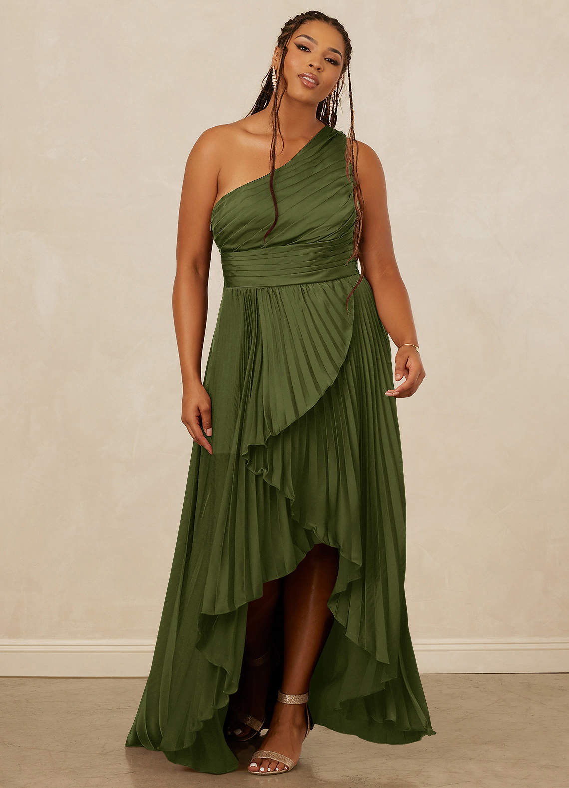 This high low length dress features a one-shoulder neckline, a hand pleated waistband, and an overlapping skirt.