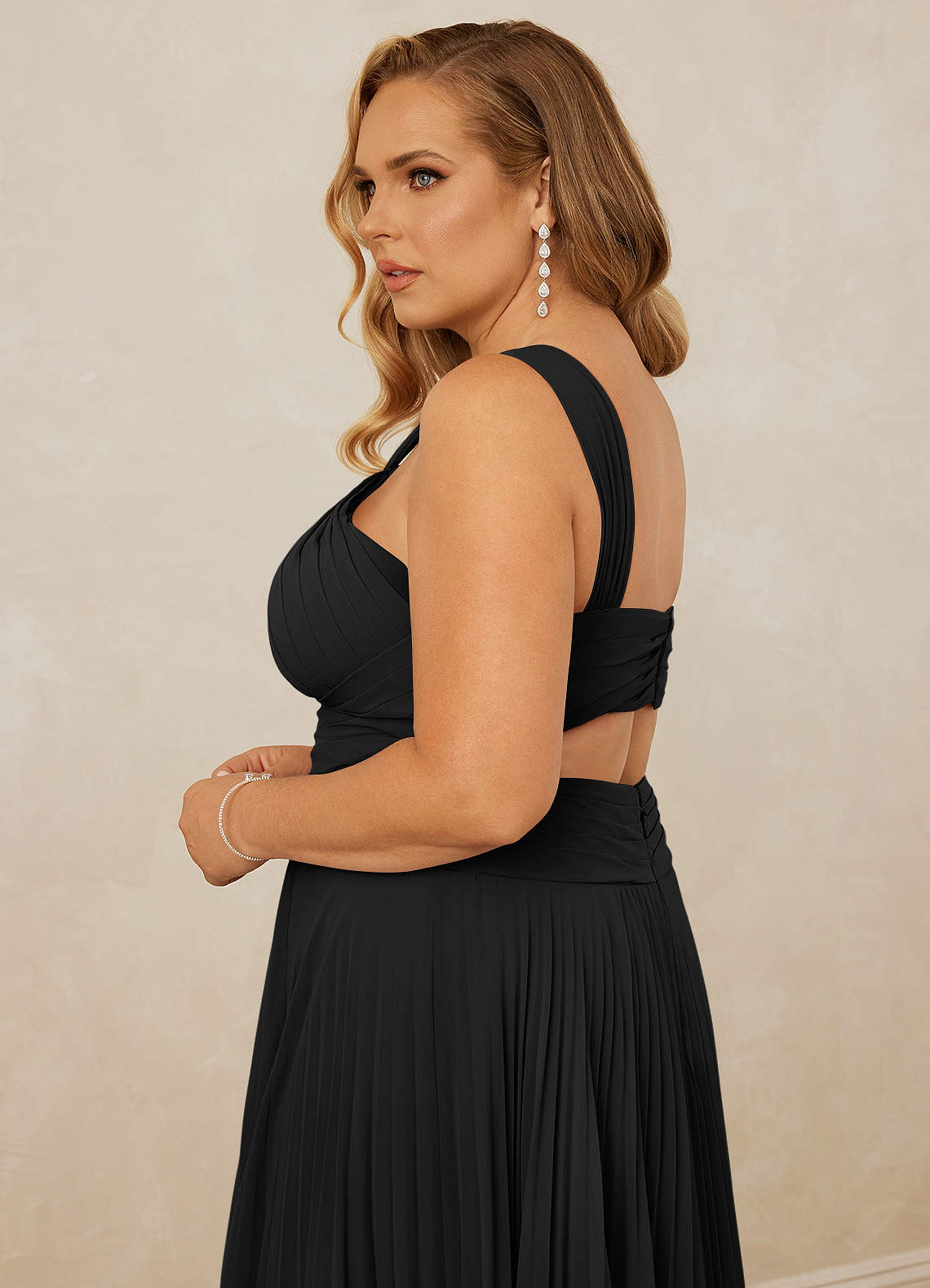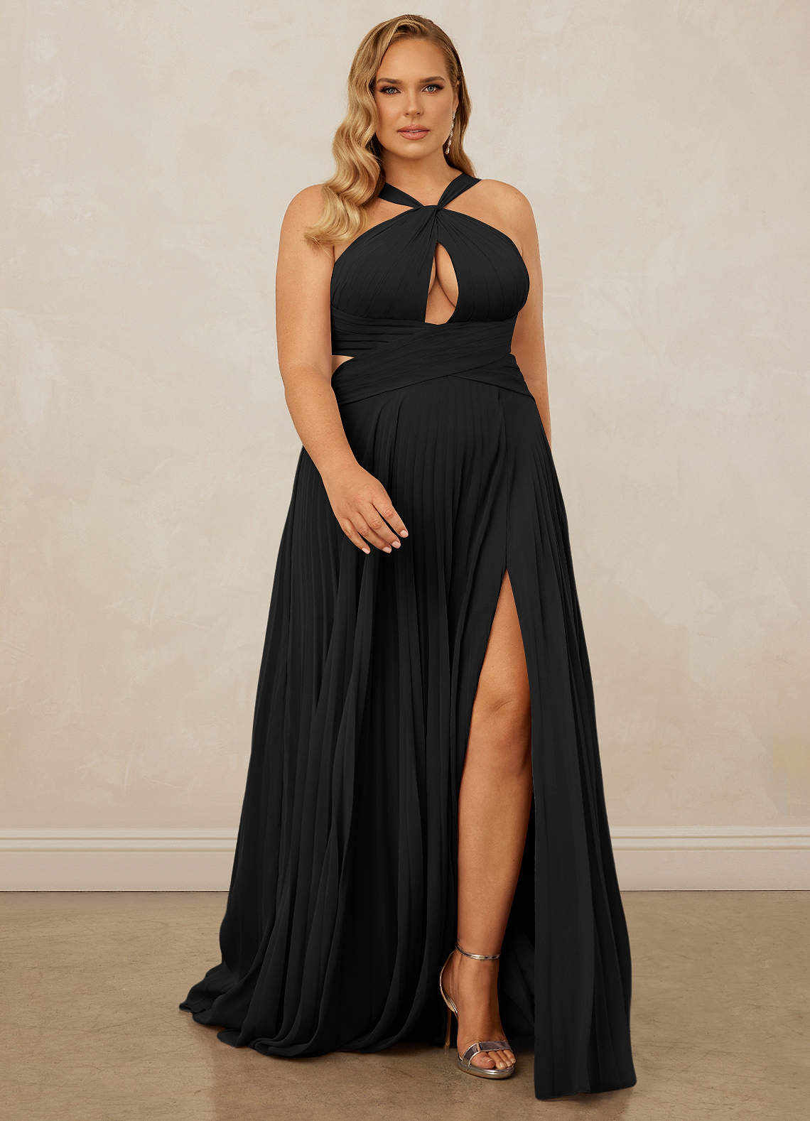 This floor length chiffon dress features a halter neckline, a pleated bodice, a front keyhole, a back cutout, and a sunburst pleated skirt.