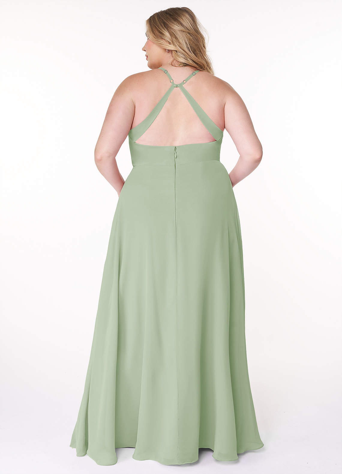 Look classically elegant wearing the Davis dress. Made from chiffon, this bridesmaid dress features a V-neckline surplice bodice with pleats. Her A-line skirt is overlapped and creates a leg slit when walking. Her delicate spaghetti straps lead to an alluring open back with a keyhole and a self-covered button closure.