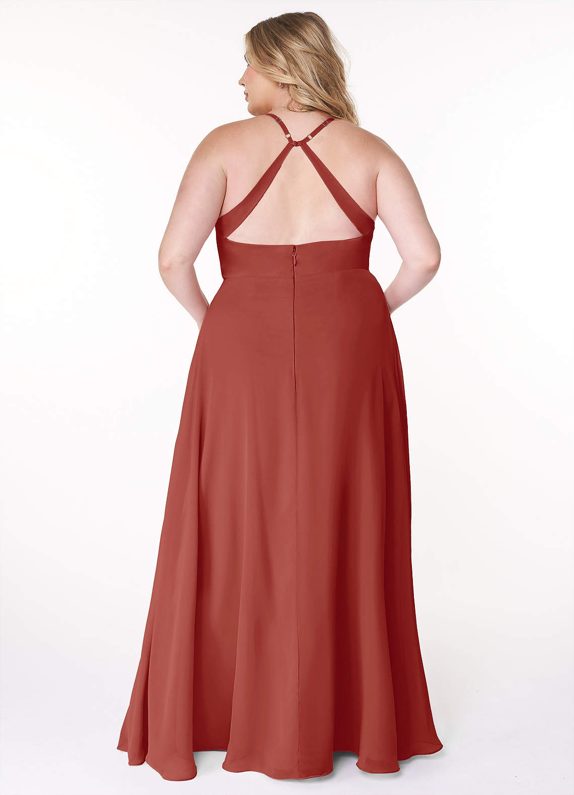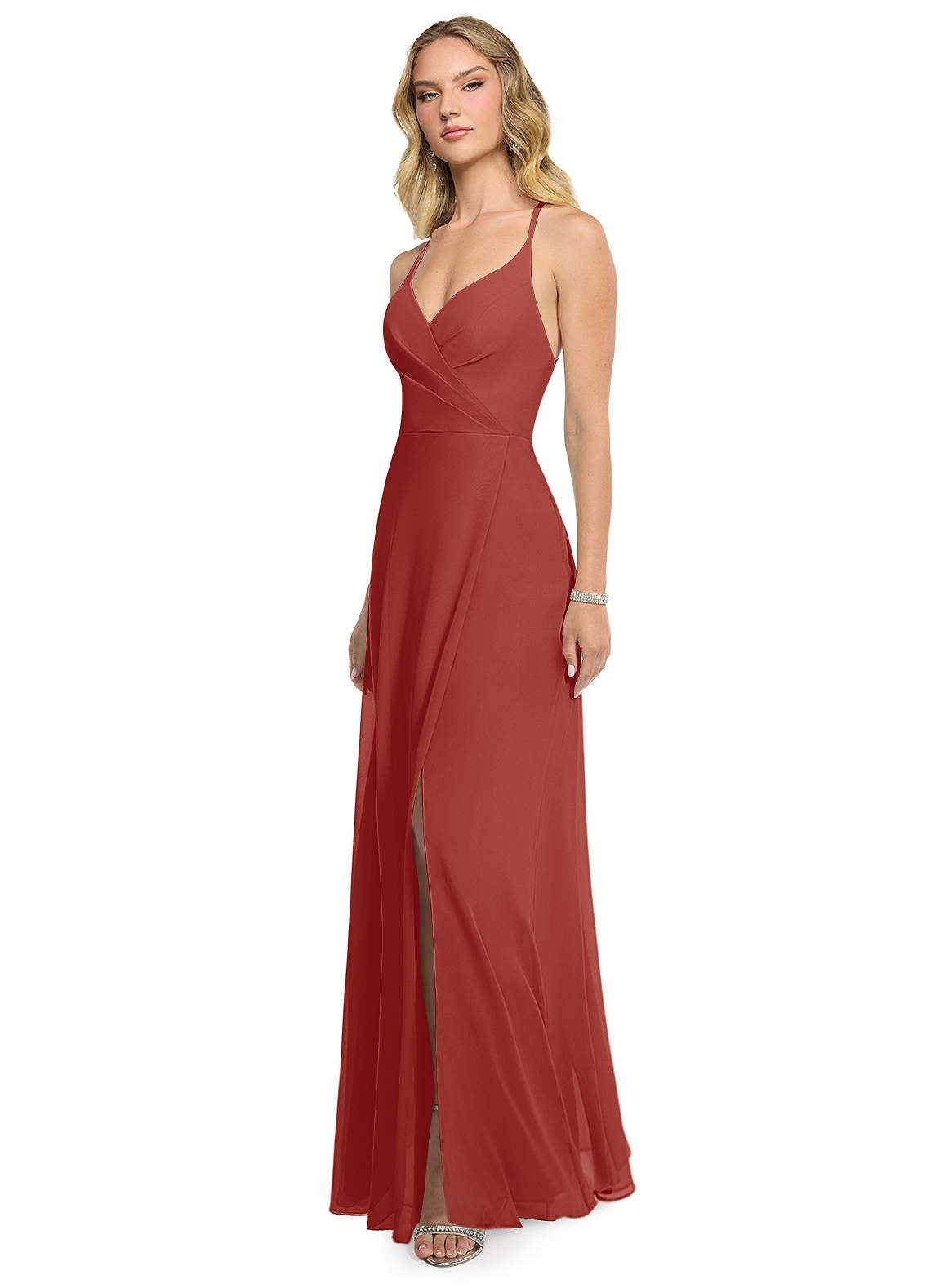 Look classically elegant wearing the Davis dress. Made from chiffon, this bridesmaid dress features a V-neckline surplice bodice with pleats. Her A-line skirt is overlapped and creates a leg slit when walking. Her delicate spaghetti straps lead to an alluring open back with a keyhole and a self-covered button closure.