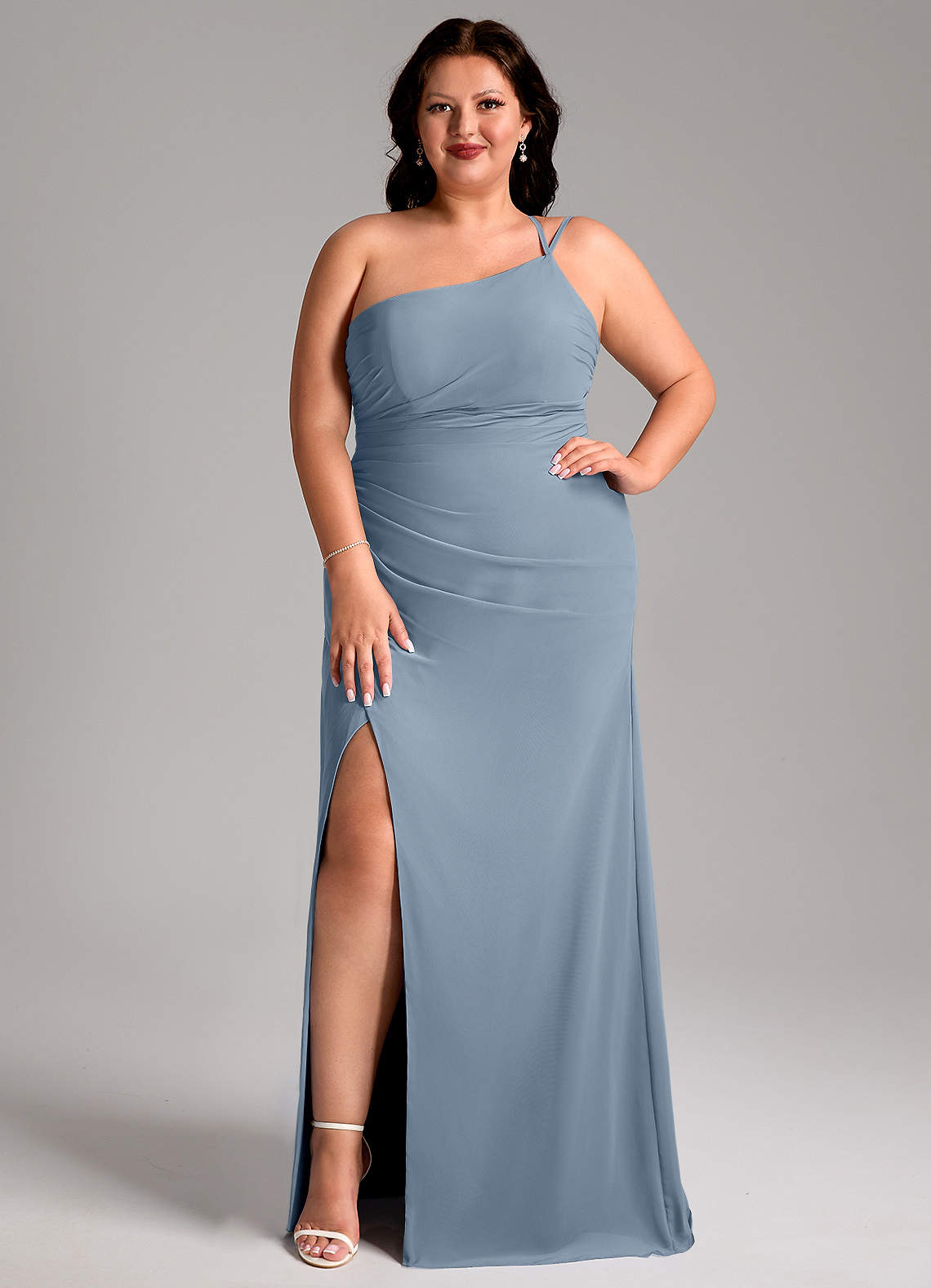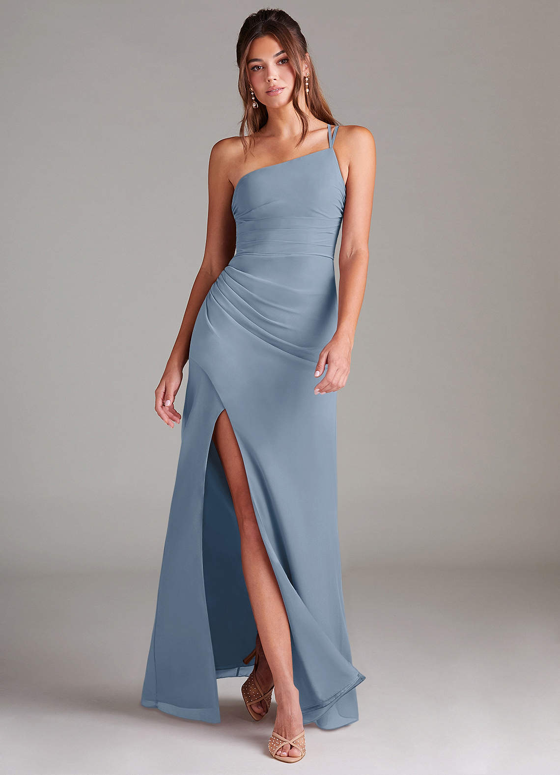 Stun the bridal party in our chiffon bridesmaid dress, Eren. Featuring an asymmetrical neckline, this bridesmaid dress is a one-shoulder style with a double strap detail. Pleating begins at the bodice and runs down onto the sheath skirt silhouette. Her draped pleated skirt overlaps and creates a dramatic leg slit when walking.