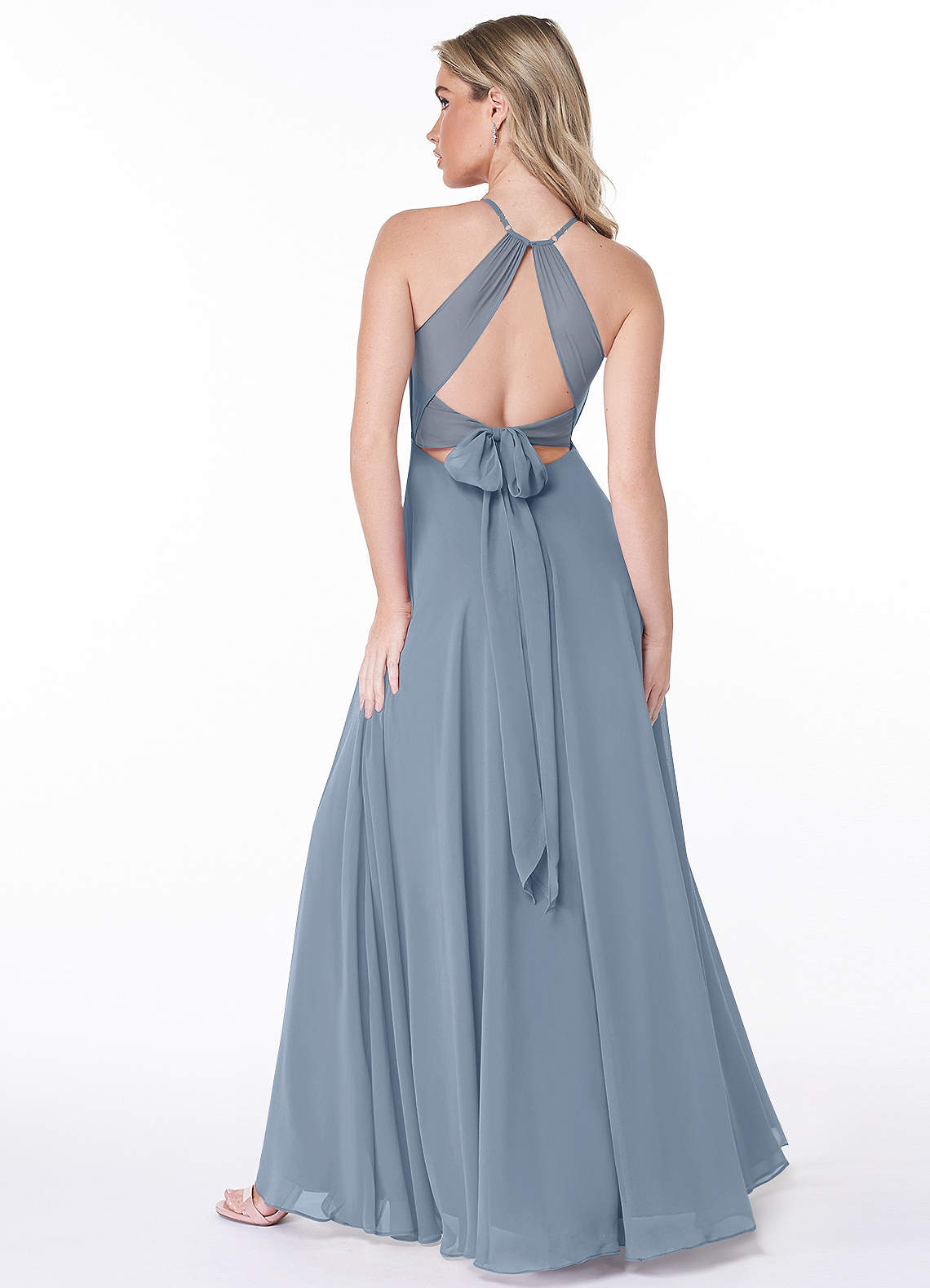 Look sexy and elegant while wearing our Evalleen bridesmaid dress. She is the perfect dress for your leading ladies. The dress displays a halter neckline with V-cutout. Her spaghetti ties lead to alluring back cut outs while her chiffon skirt flares into a flowy A-line skirt with a sexy leg slit.