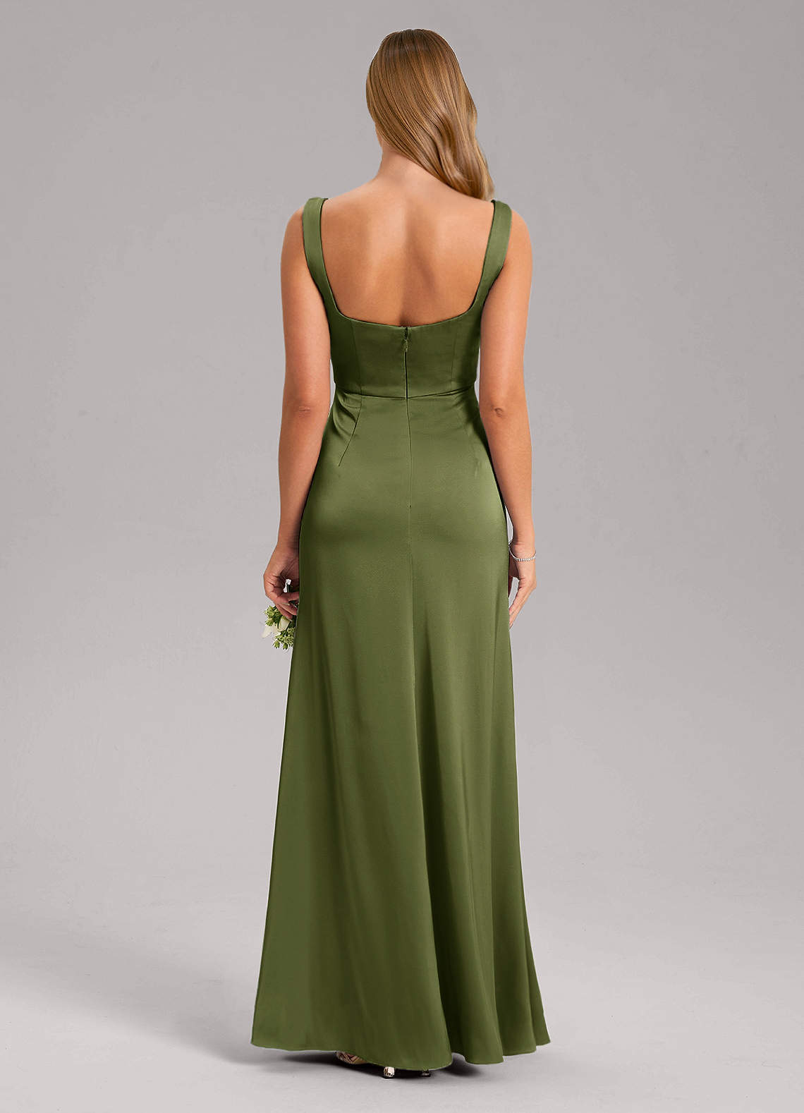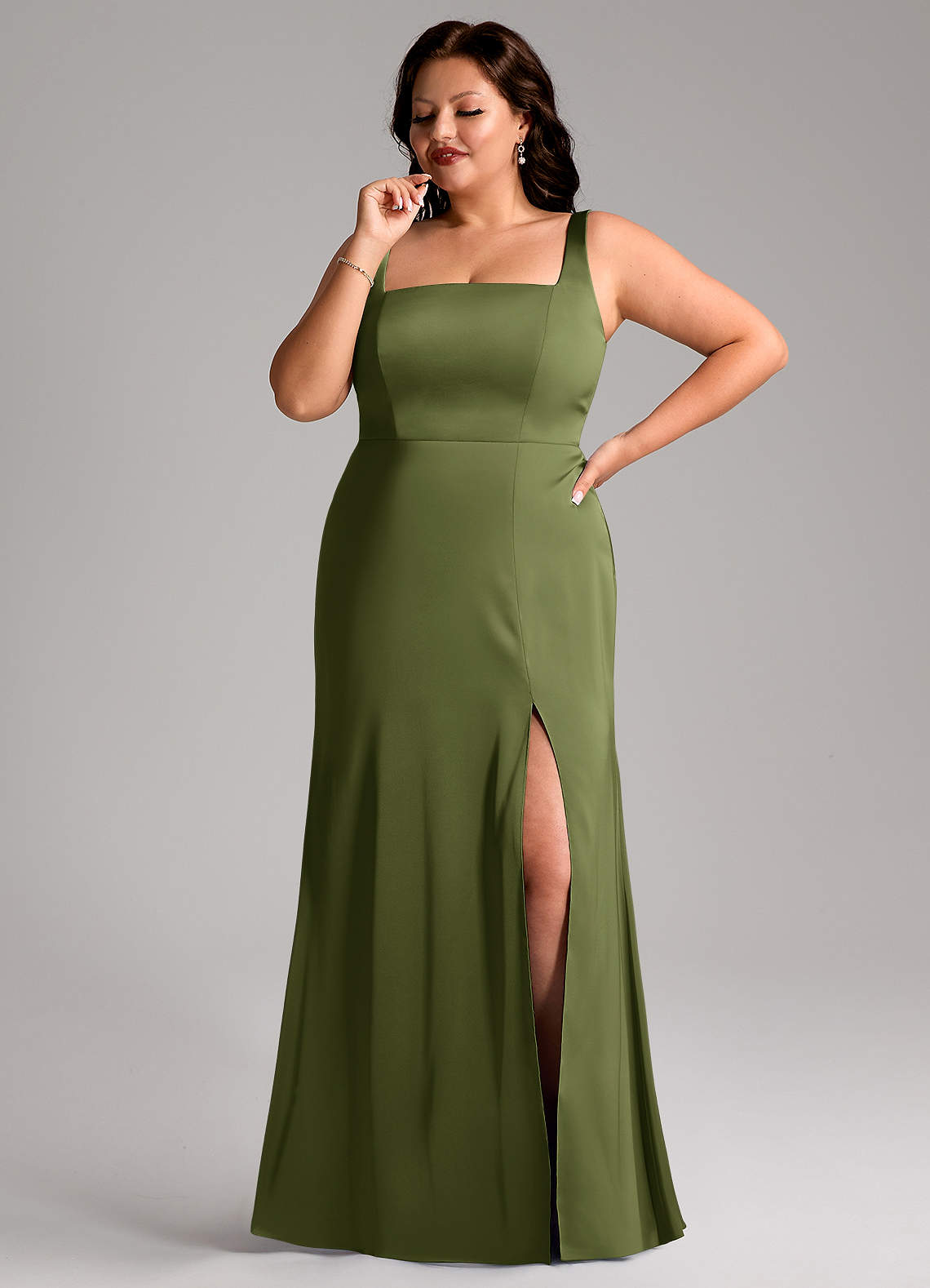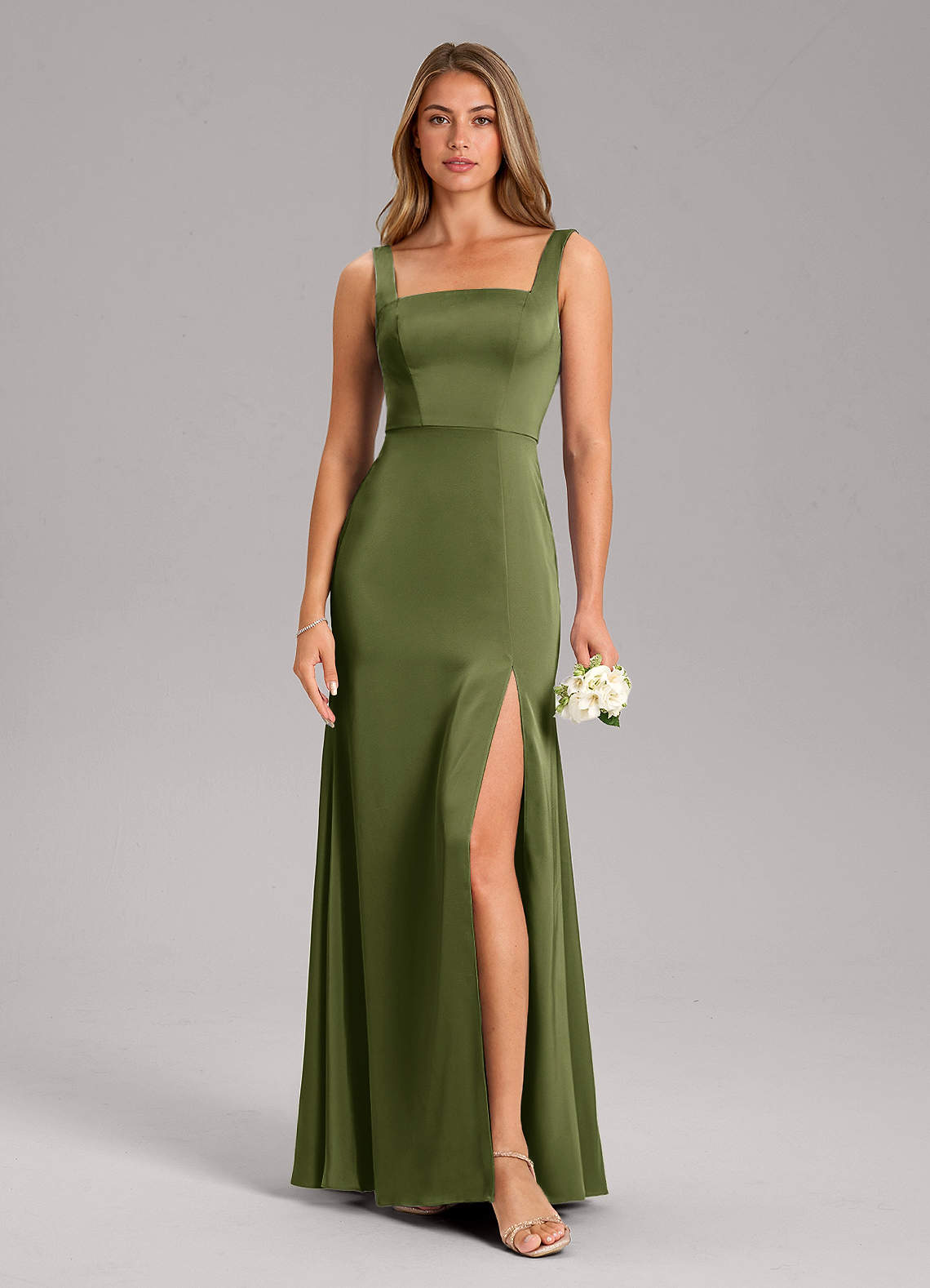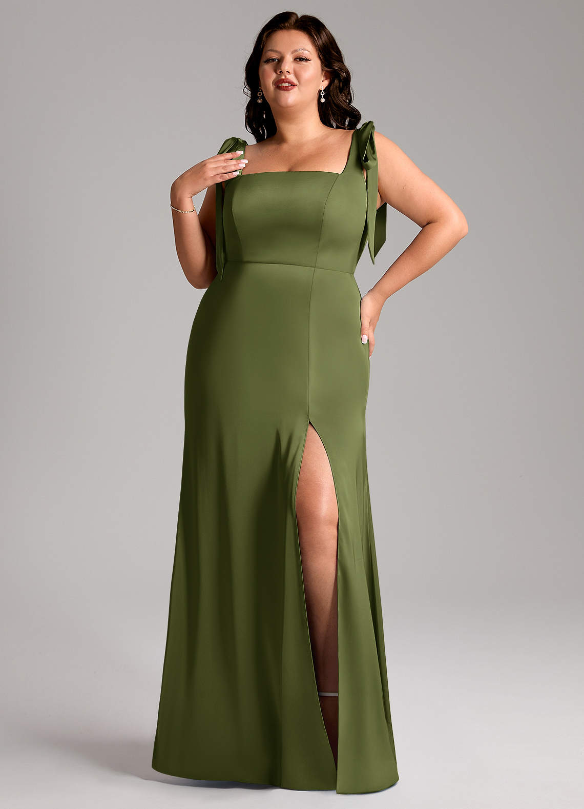 Chic with a touch of whimsy, the Frostine dress is a floor-length A-line design in smooth stretch satin, featuring a modern square neckline, thick straps, and a bold statement bow on one shoulder. A flowing skirt with a leg slit adds graceful movement and a hint of allure.