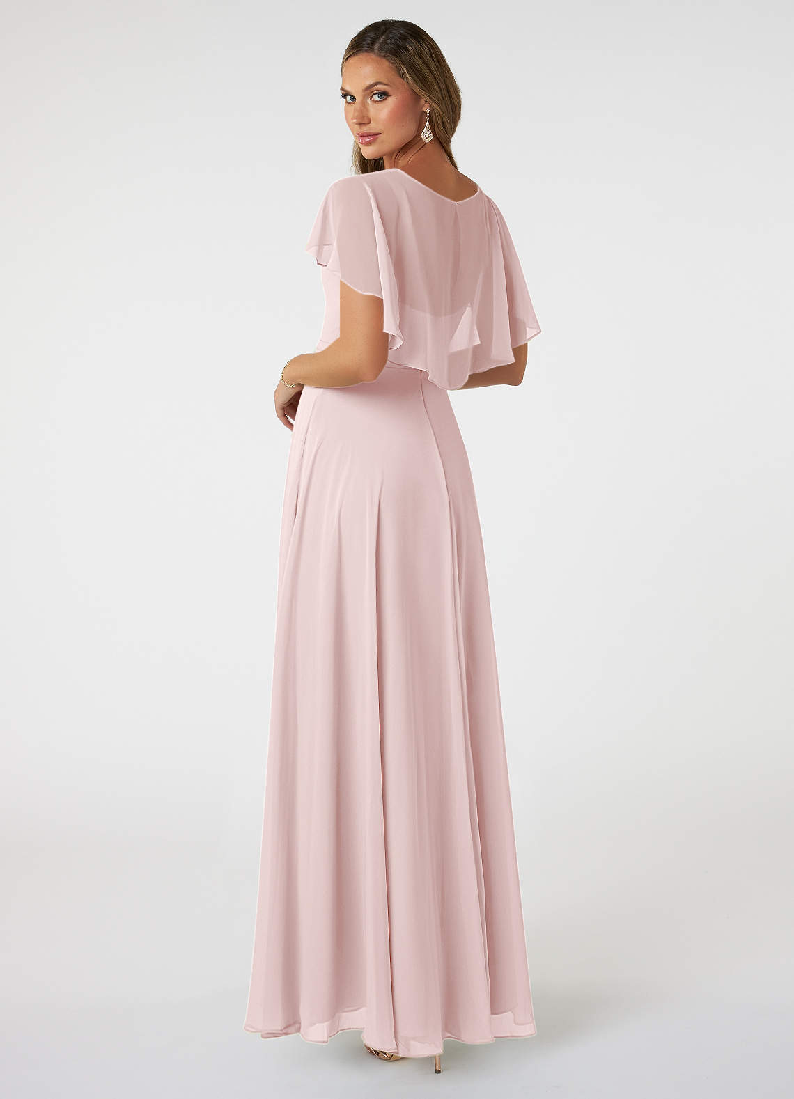 We are loving the capelet on Jamie that gives you the perfect faux sleeve while adding just the right amount of coverage. Topped off with a plunging v-neckline and chiffon waistband you are sure to feel beautiful for any occasion. This bridesmaid dress is available in full size range (A0-A30) and custom sizing.