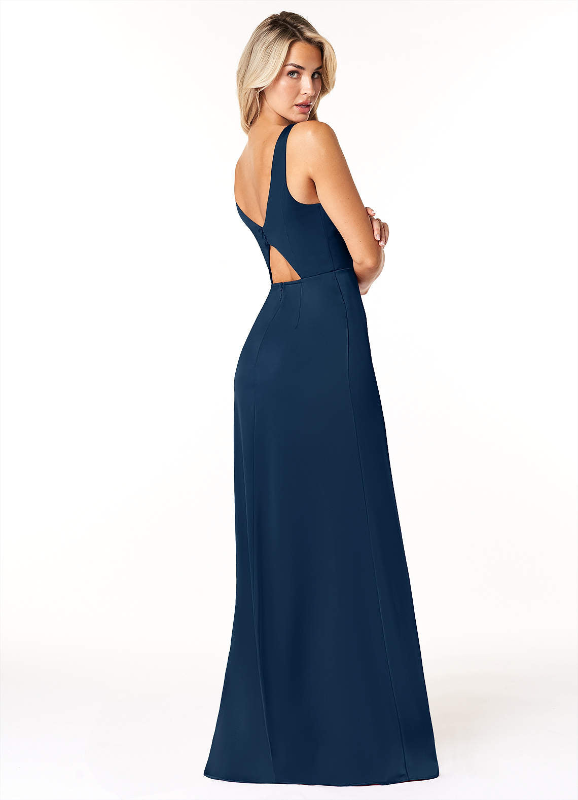 Jess is a sophisticated bridesmaid dress for the bridesmaid who wants a clean and classic look. Cut from stretch satin, this bridesmaid dress features a V-neckline with thick straps. The back bodice comes with a keyhole cutout and cover buttons. The look is complete with an A-line skirt paired with a leg slit.