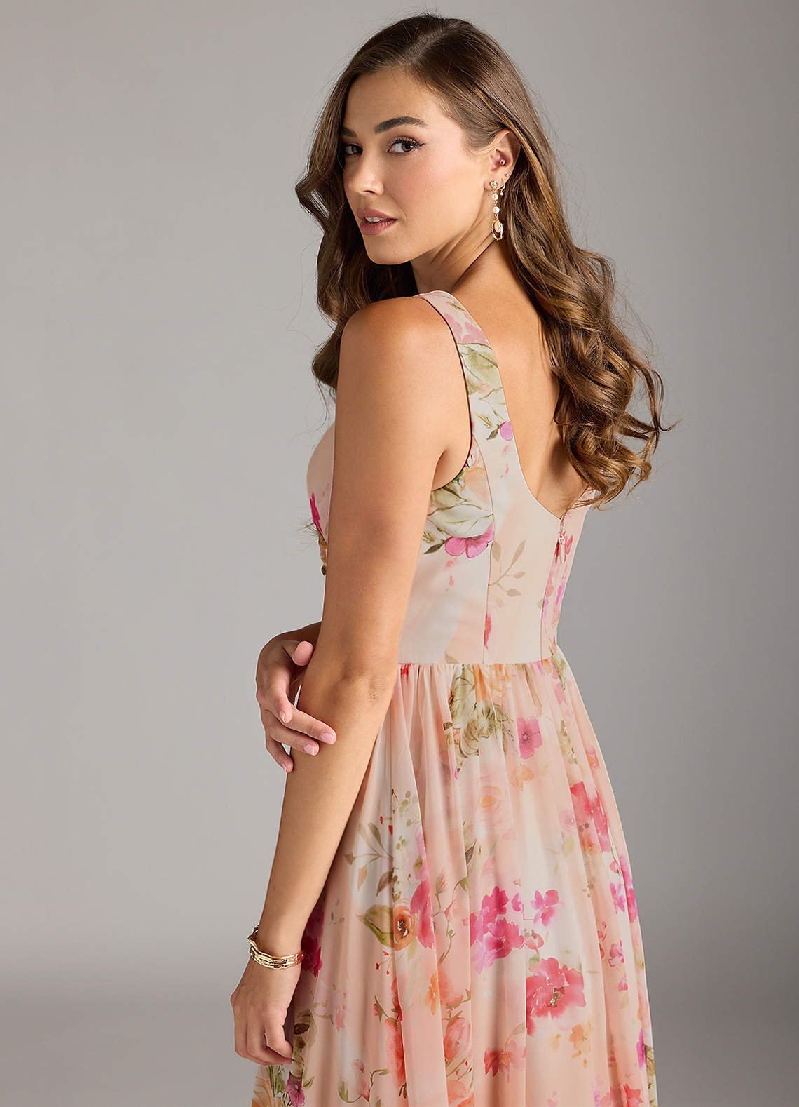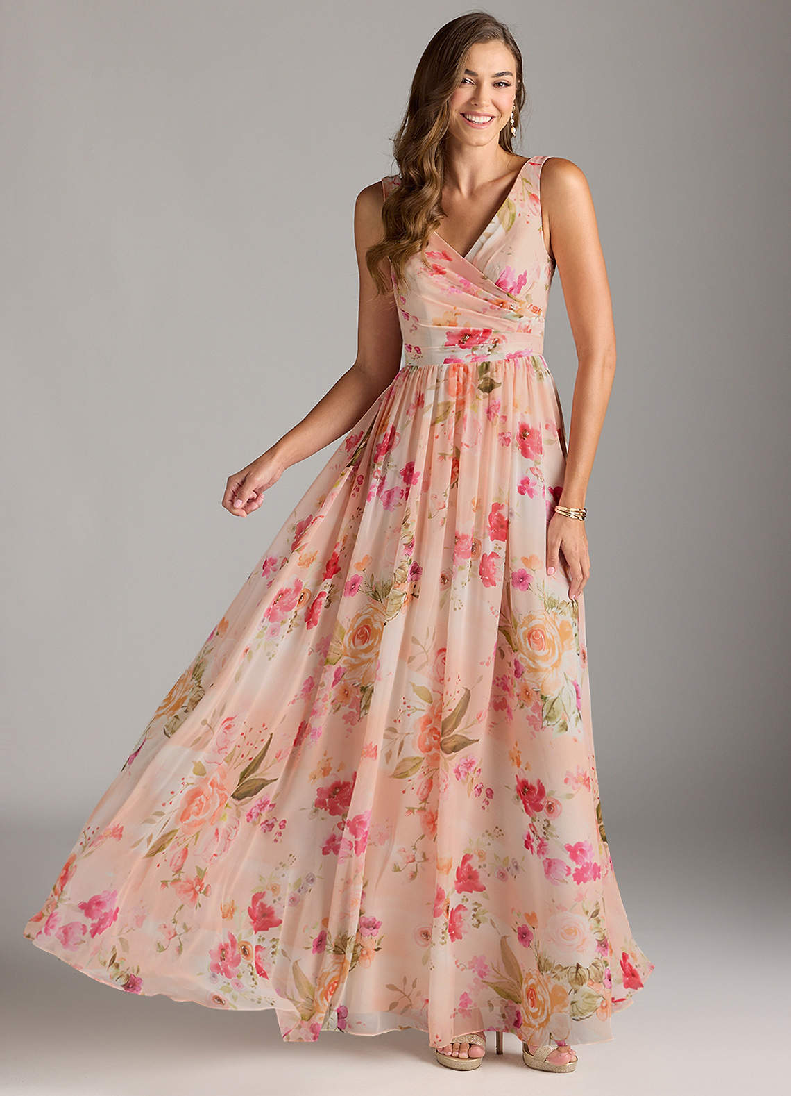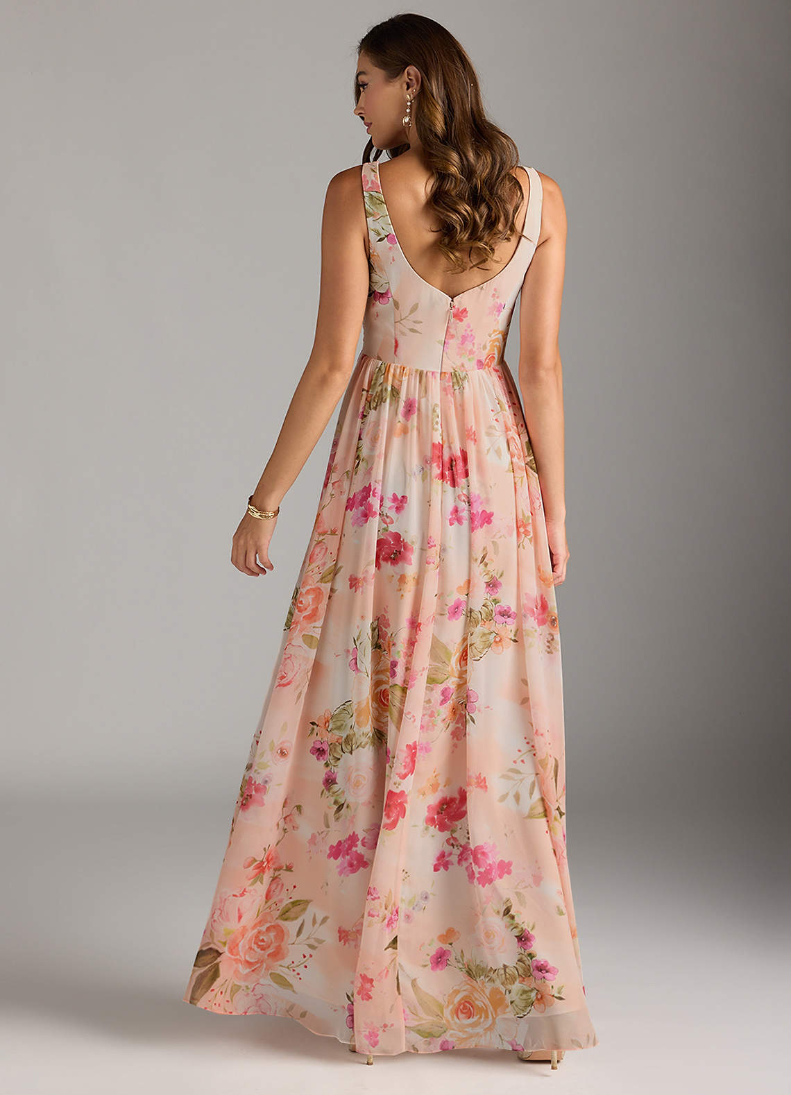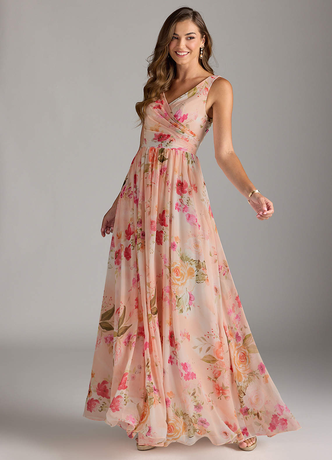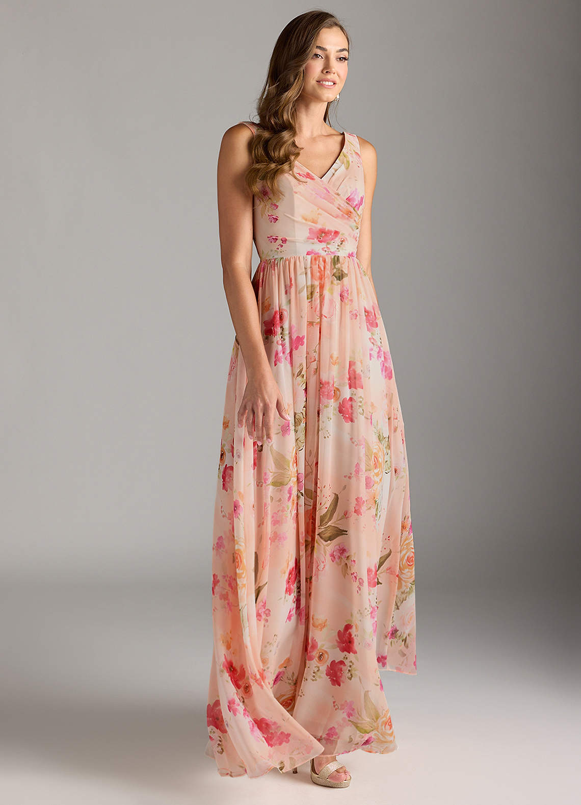 Keyla is a floor-length gown in an A-line cut. Made of chiffon, this dress features a v neckline. This bridesmaid dress is available in full size range (A0-A30) and custom sizing.