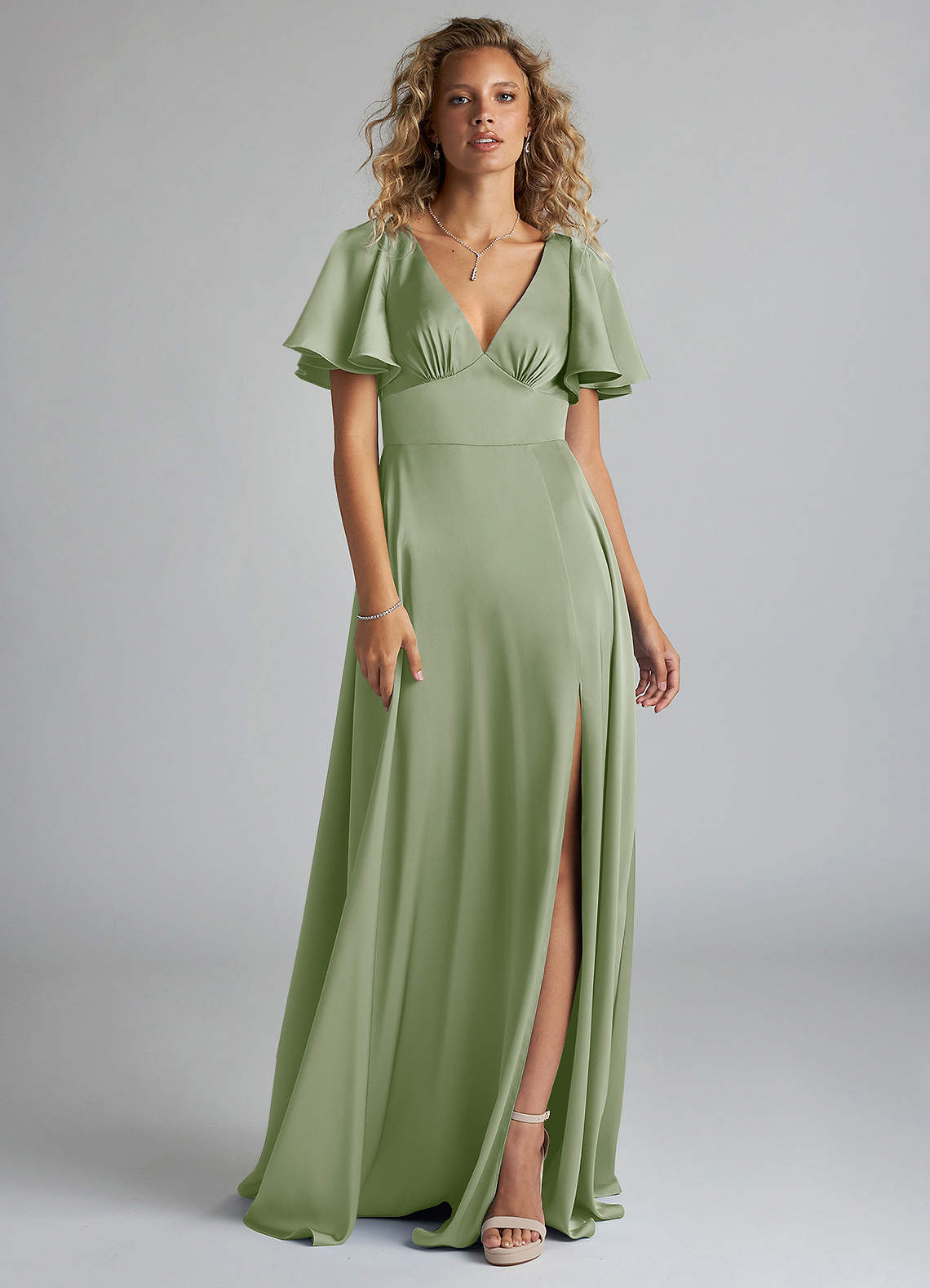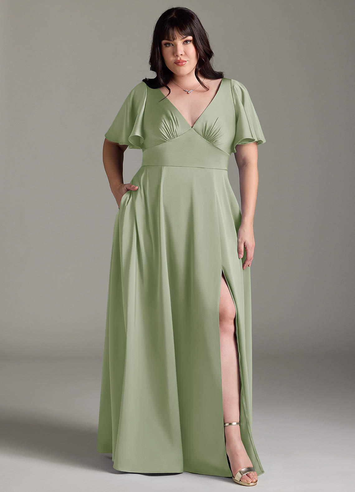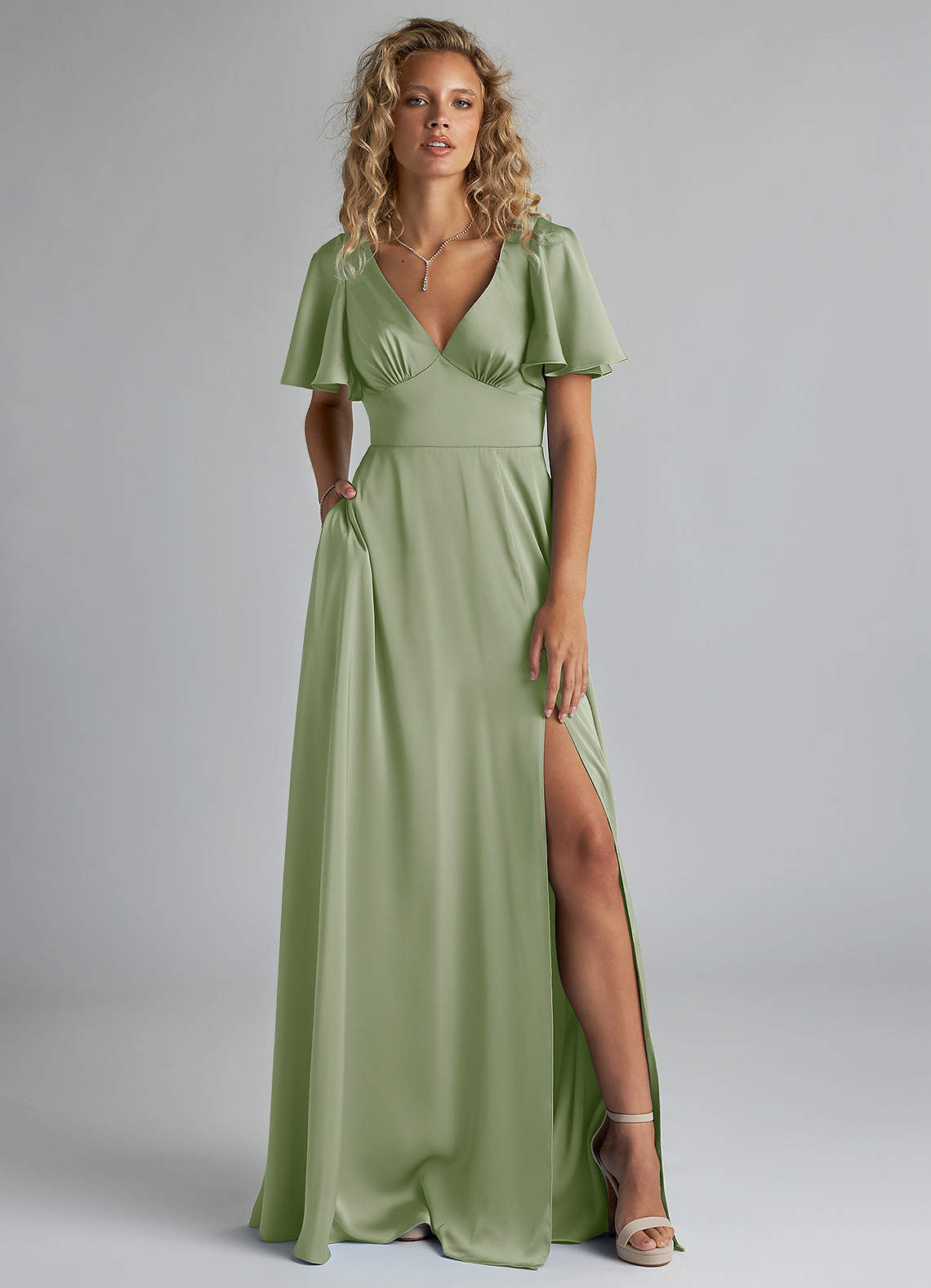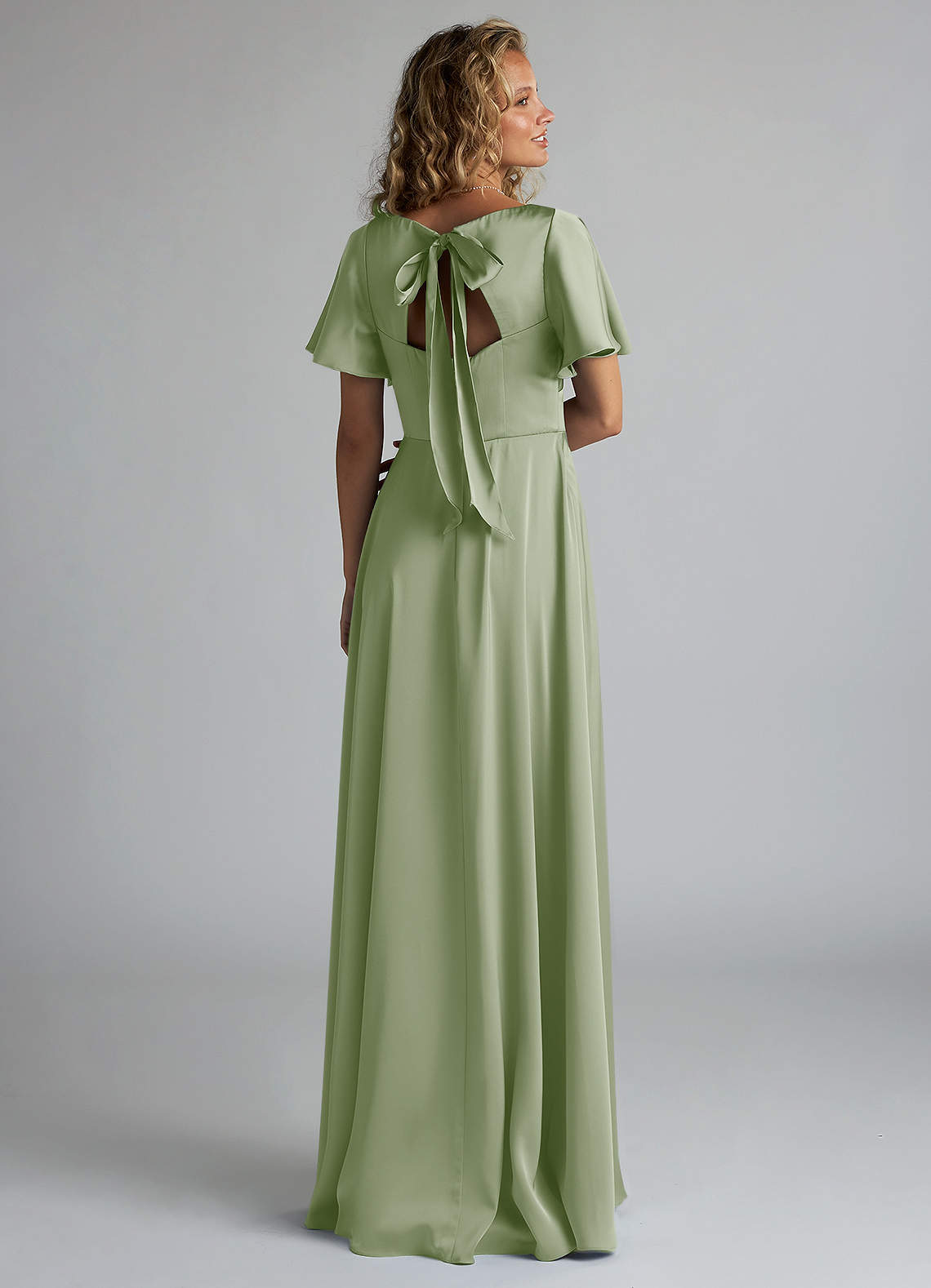 Kimber is a refreshing, modern choice for your bridal party. Featuring a V-neck bodice with an accentuating under-bust seam, the silhouette is highlighted by a stunning butterfly sleeve design. Her back bodice has a tieable bow detail with a keyhole opening. Her floor length A-line skirt has a leg slit that provides comfort for walking. We have also added pockets!