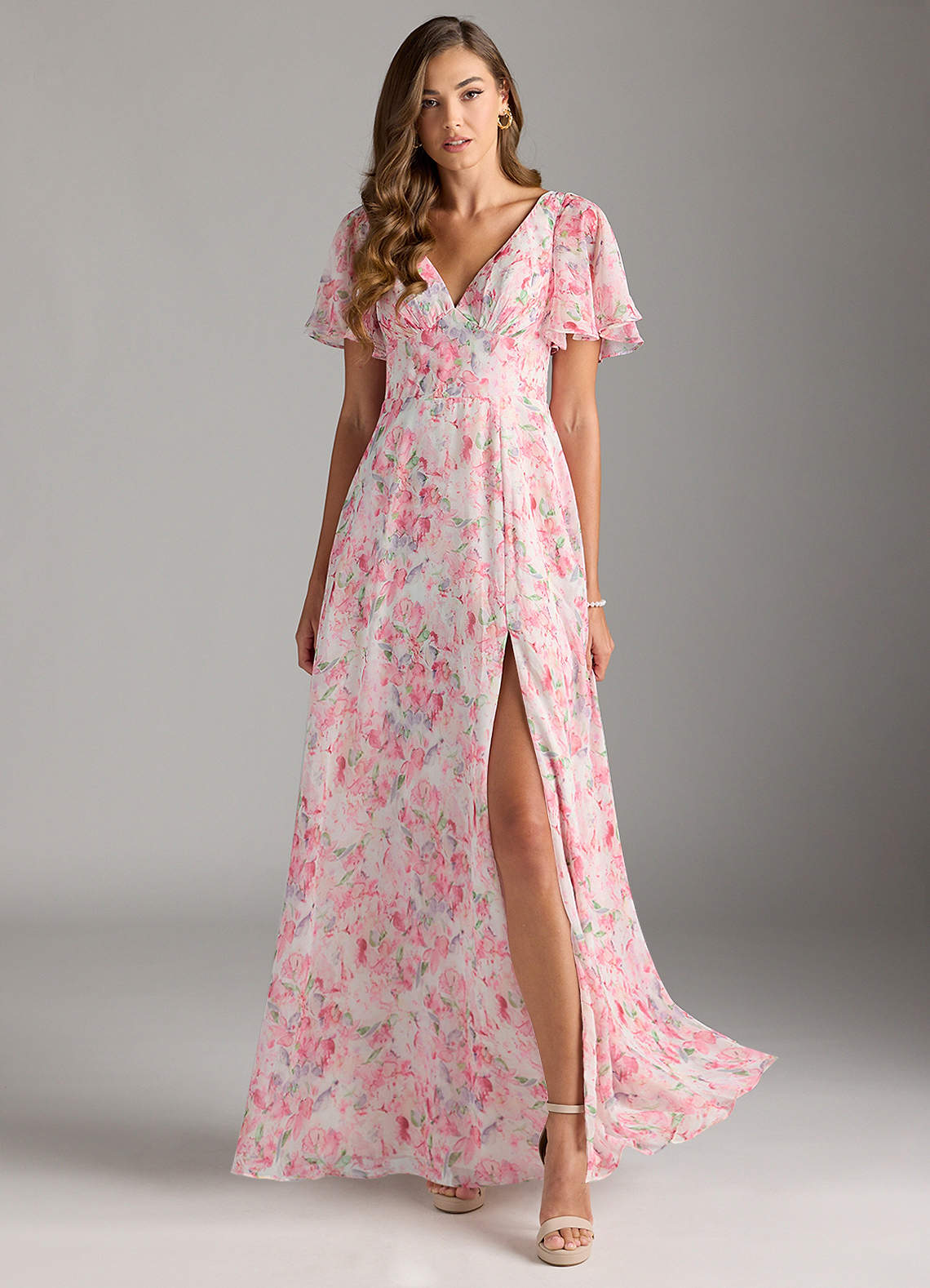 Kimber is a refreshing, modern choice for your bridal party. Featuring a V-neck bodice with an accentuating under-bust seam, the silhouette is highlighted by a stunning butterfly sleeve design. Her back bodice has a tieable bow detail with a keyhole opening. Her floor length A-line skirt has a leg slit that provides comfort for walking. We have also added pockets!