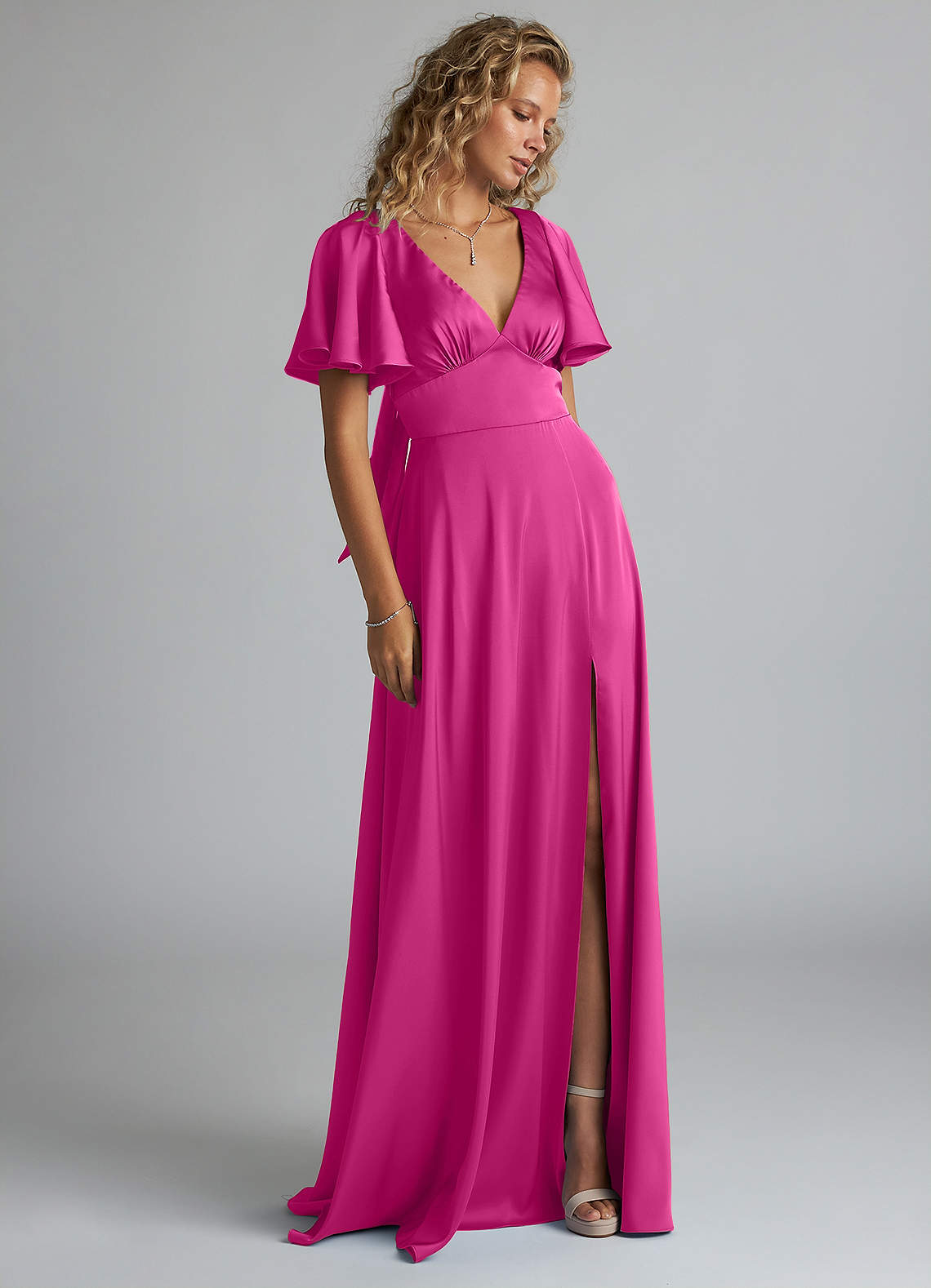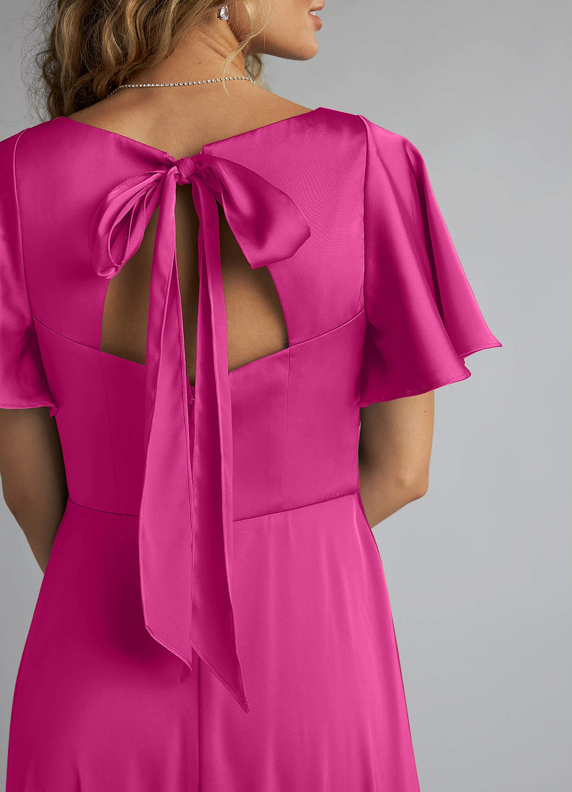 Kimber is a refreshing, modern choice for your bridal party. Featuring a V-neck bodice with an accentuating under-bust seam, the silhouette is highlighted by a stunning butterfly sleeve design. Her back bodice has a tieable bow detail with a keyhole opening. Her floor length A-line skirt has a leg slit that provides comfort for walking. We have also added pockets!