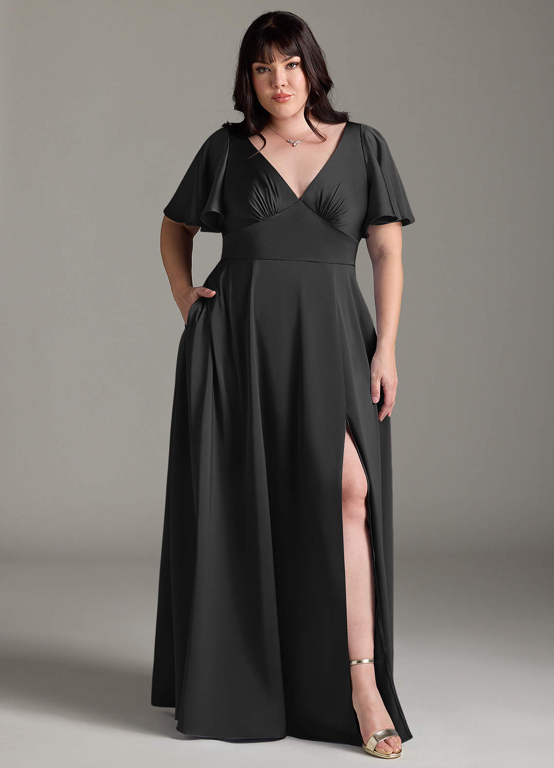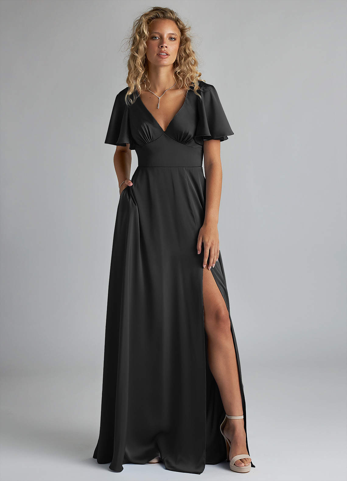 Kimber is a refreshing, modern choice for your bridal party. Featuring a V-neck bodice with an accentuating under-bust seam, the silhouette is highlighted by a stunning butterfly sleeve design. Her back bodice has a tieable bow detail with a keyhole opening. Her floor length A-line skirt has a leg slit that provides comfort for walking. We have also added pockets!