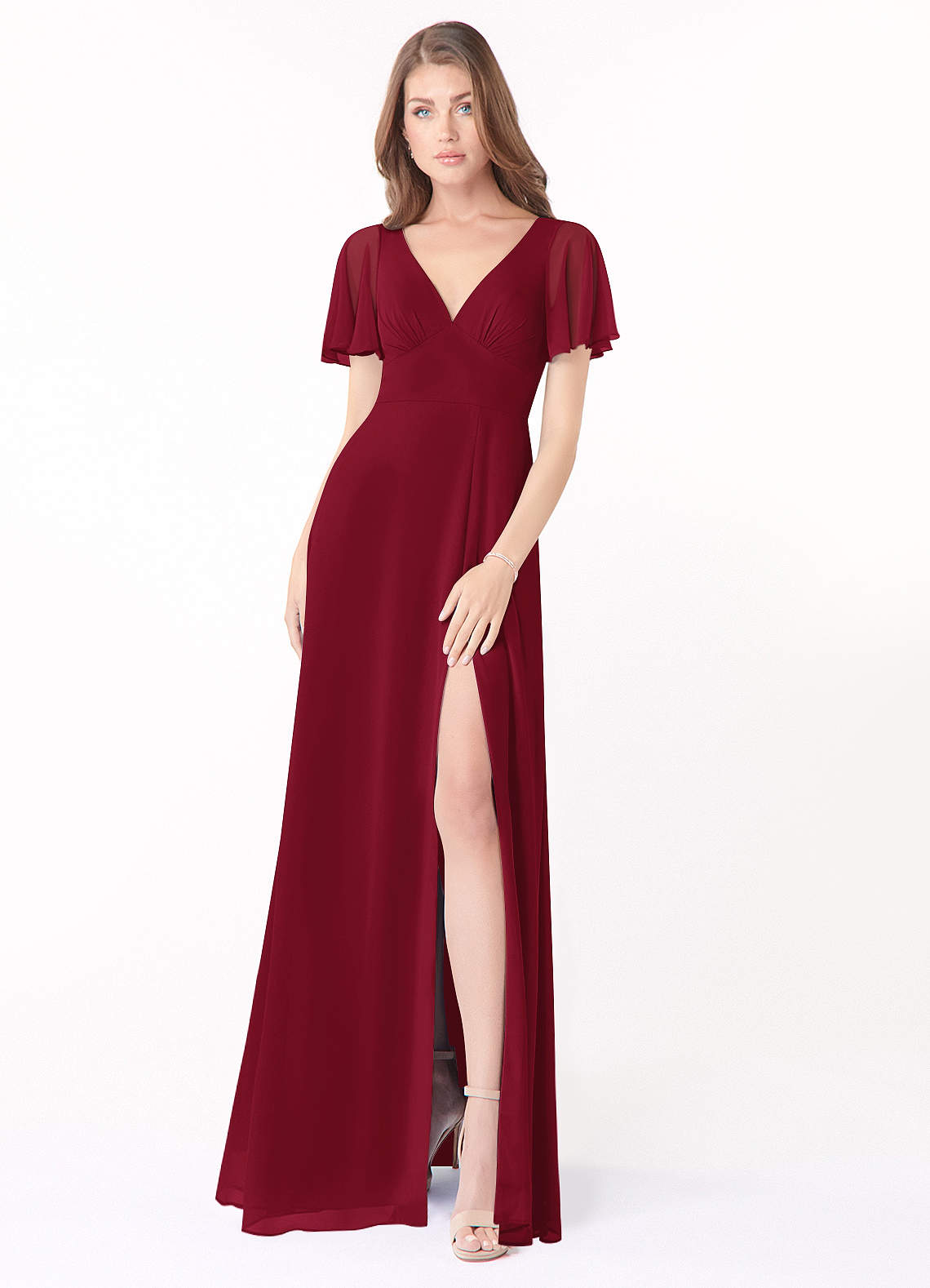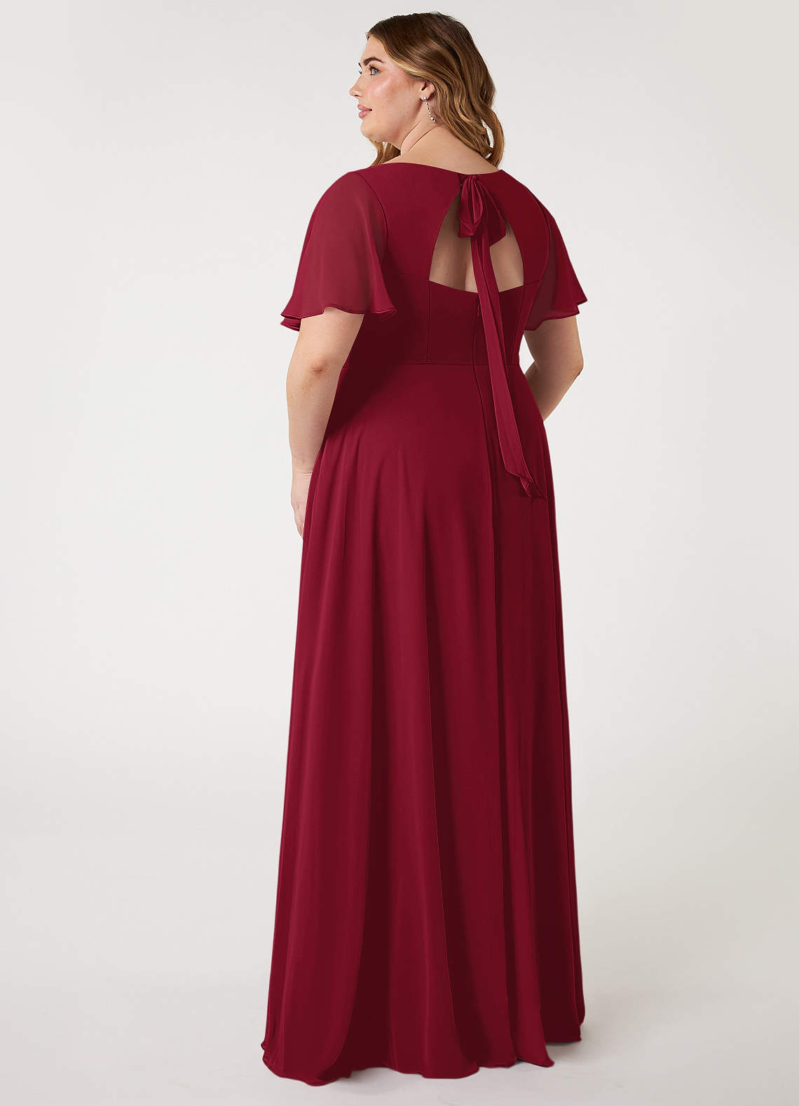 Kimber is a refreshing, modern choice for your bridal party. Featuring a V-neck bodice with an accentuating under-bust seam, the silhouette is highlighted by a stunning butterfly sleeve design. Her back bodice has a tieable bow detail with a keyhole opening. Her floor length A-line skirt has a leg slit that provides comfort for walking. We have also added pockets!