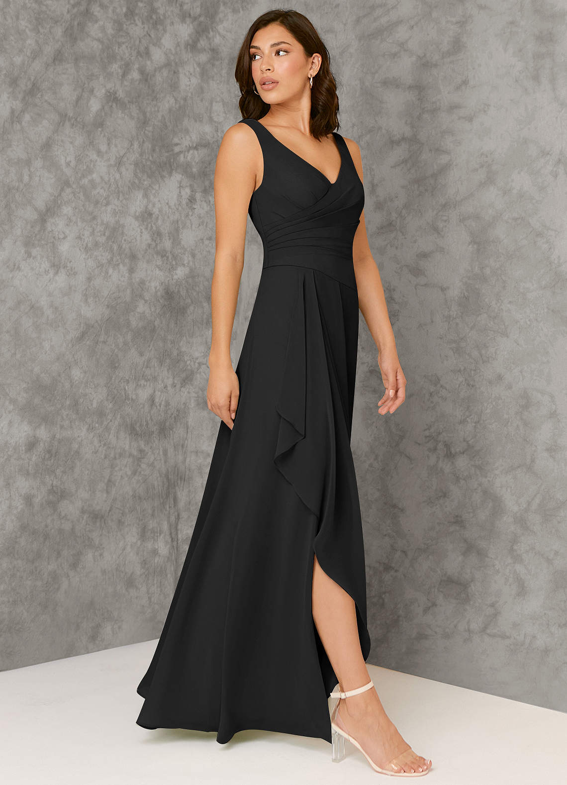 Kori is a sophisticated and elegant dress for your leading ladies. Made from chiffon, this bridesmaid dress features a tank V-neckline with a surplice overlap and soft pleating along the bodice. Her gorgeous A-line skirt features a cascading ruffle that flows beautifully along a side leg slit.