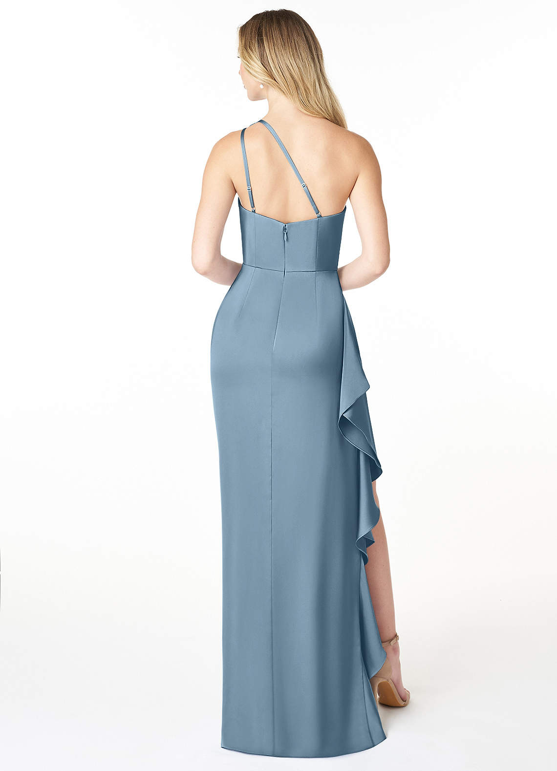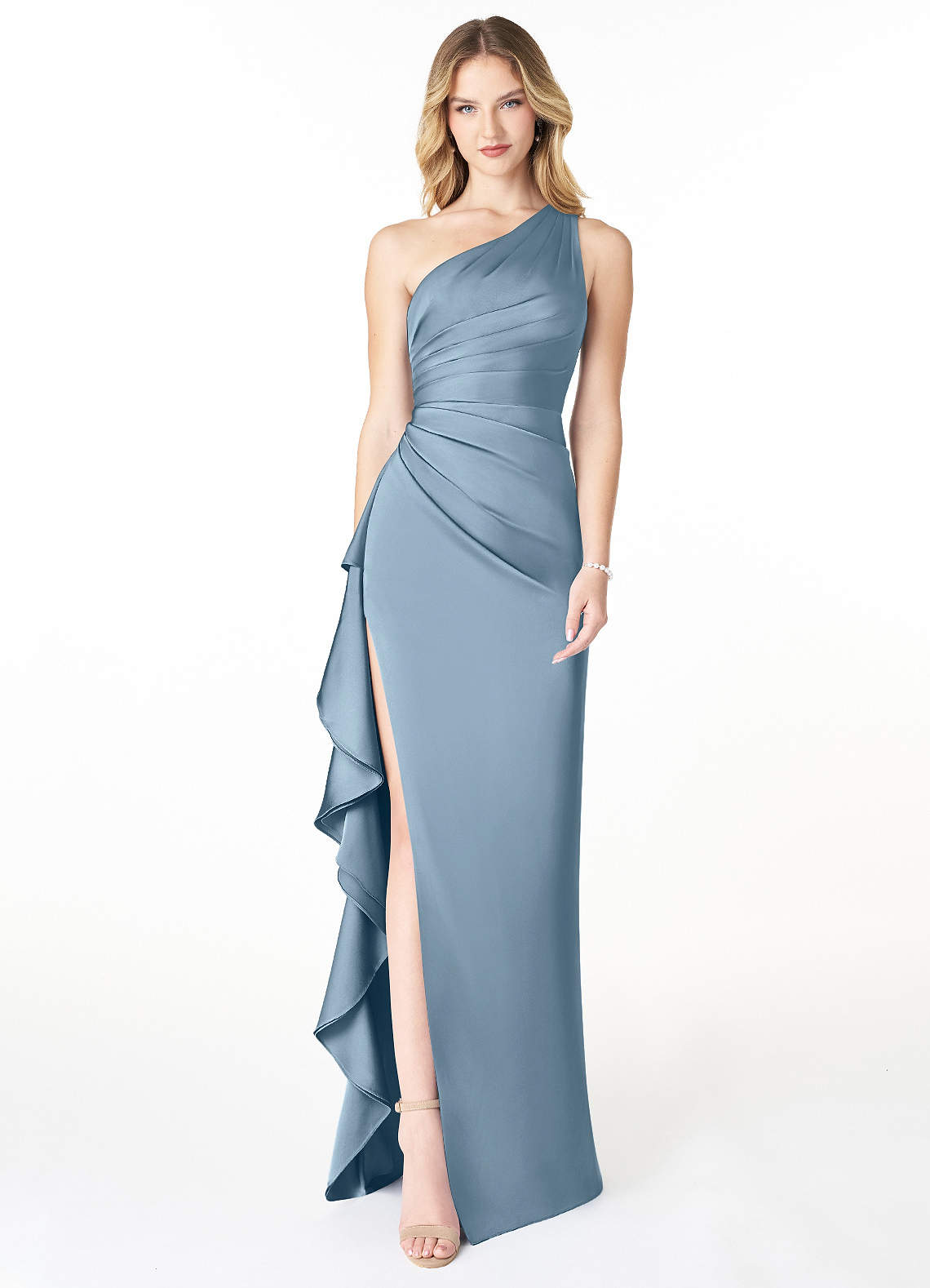 Latrice is our stunning one-shoulder stretch satin dress. She features pleats along the bodice and skirt, an adjustable spaghetti strap back, and a gorgeous ruffle down her side leg slit.