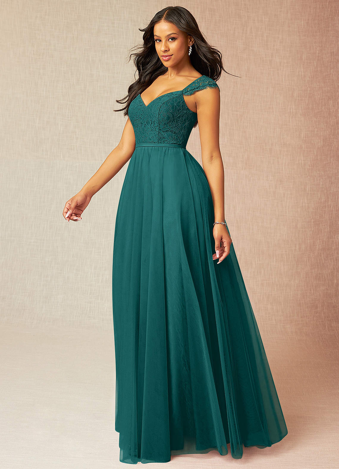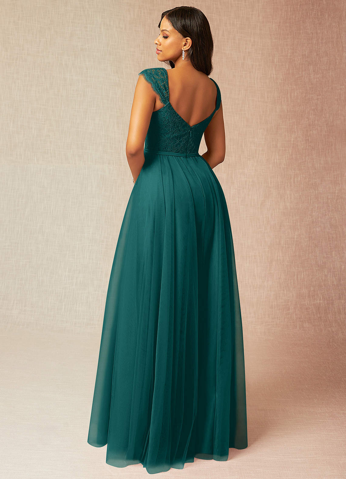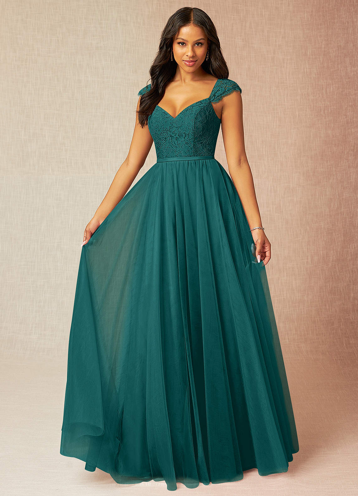 Luxi is our stunning bridesmaid dress crafted from tulle. She features a V-neckline paired with cap sleeves that lead to a V-back. The look is complete with a gathered A-line skirt.