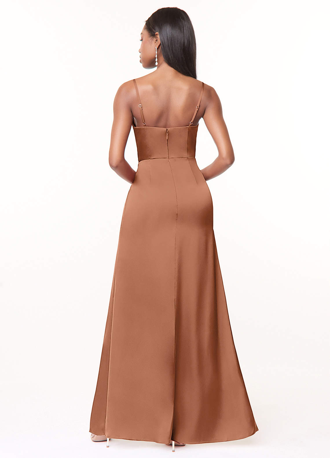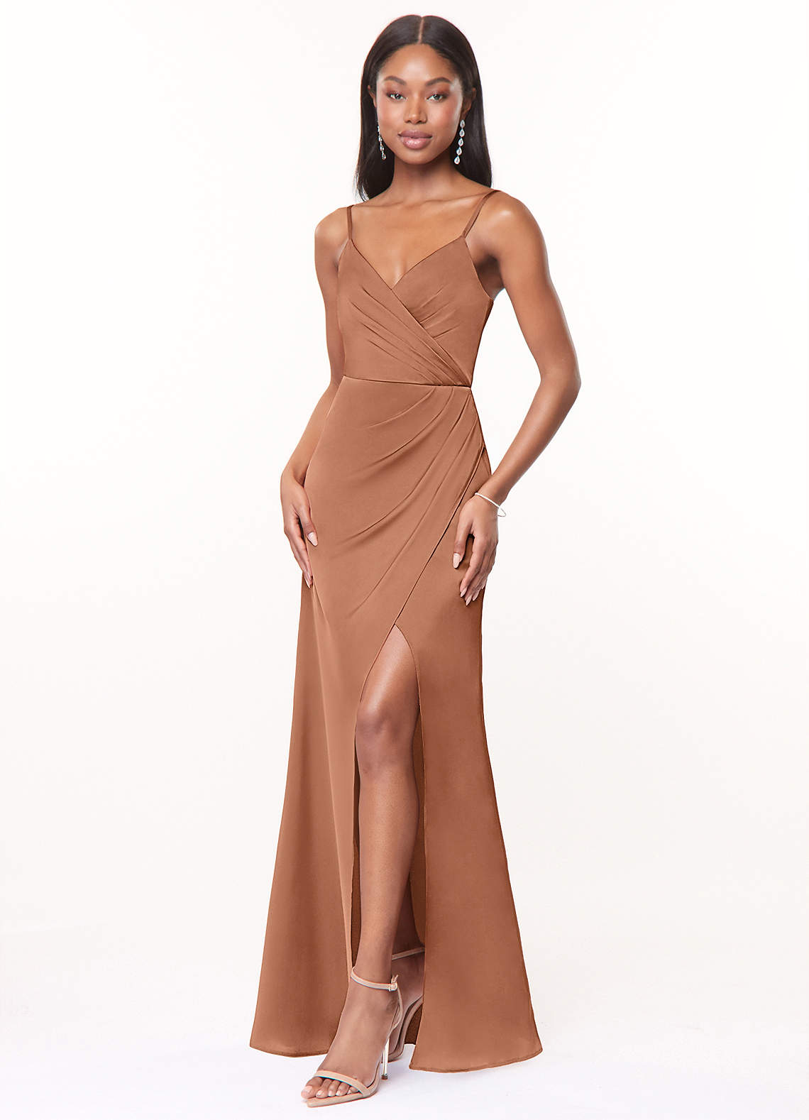 Keep your bridal party looking stylish as ever while wearing our stretch satin column bridesmaid dress, Maci. She has a V-neckline held by delicate spaghetti straps, complimented with soft pleats that flow gracefully into the draped bridesmaid dress that opens up to a leg slit.