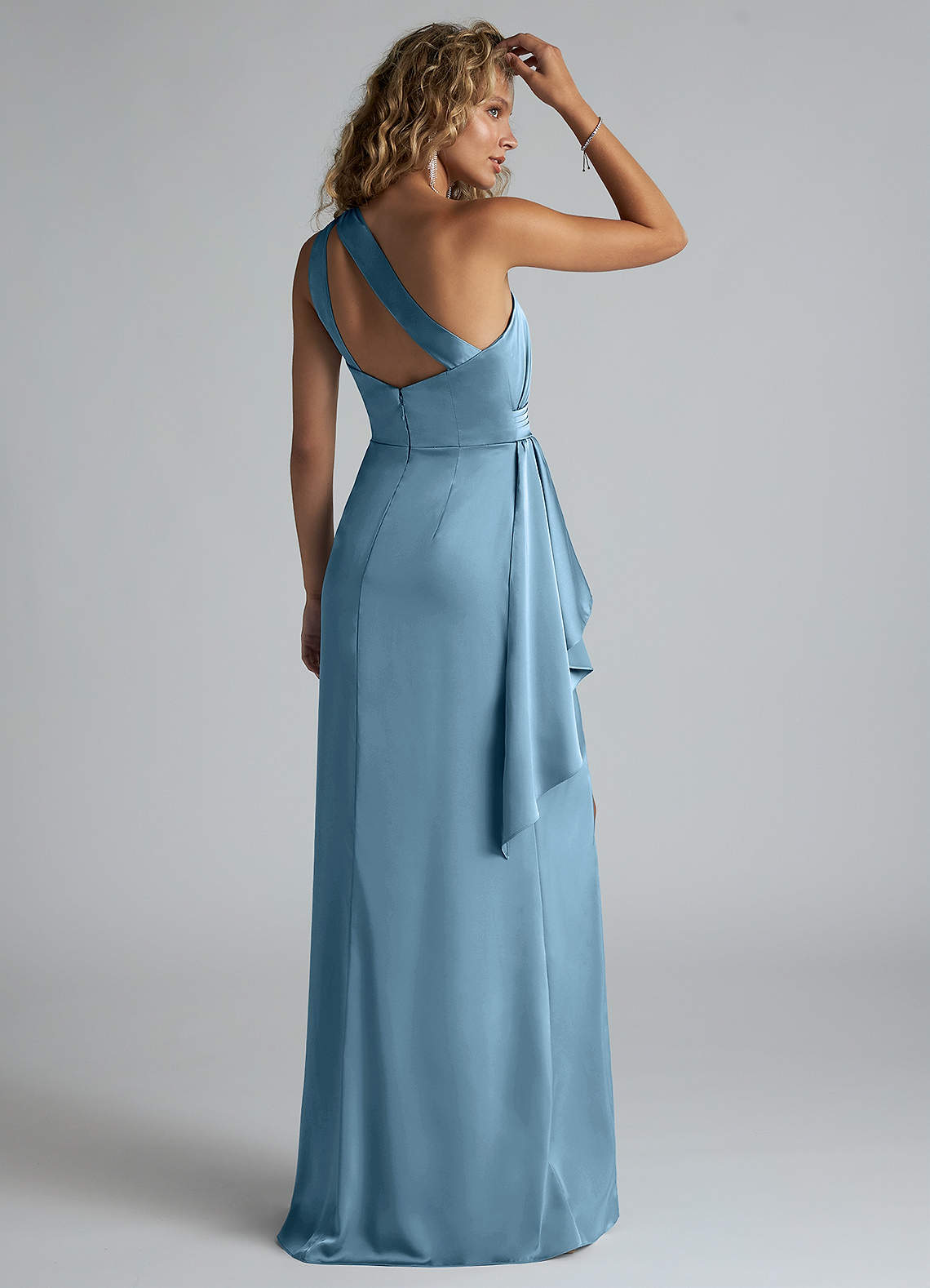 Maive is perfect for any bridesmaid who loves a one-shoulder sheath dress. Her bodice has delicate pleating that is held by two back straps. The pleats cascade onto the skirt and compliment the ruffle side detail and leg slit.