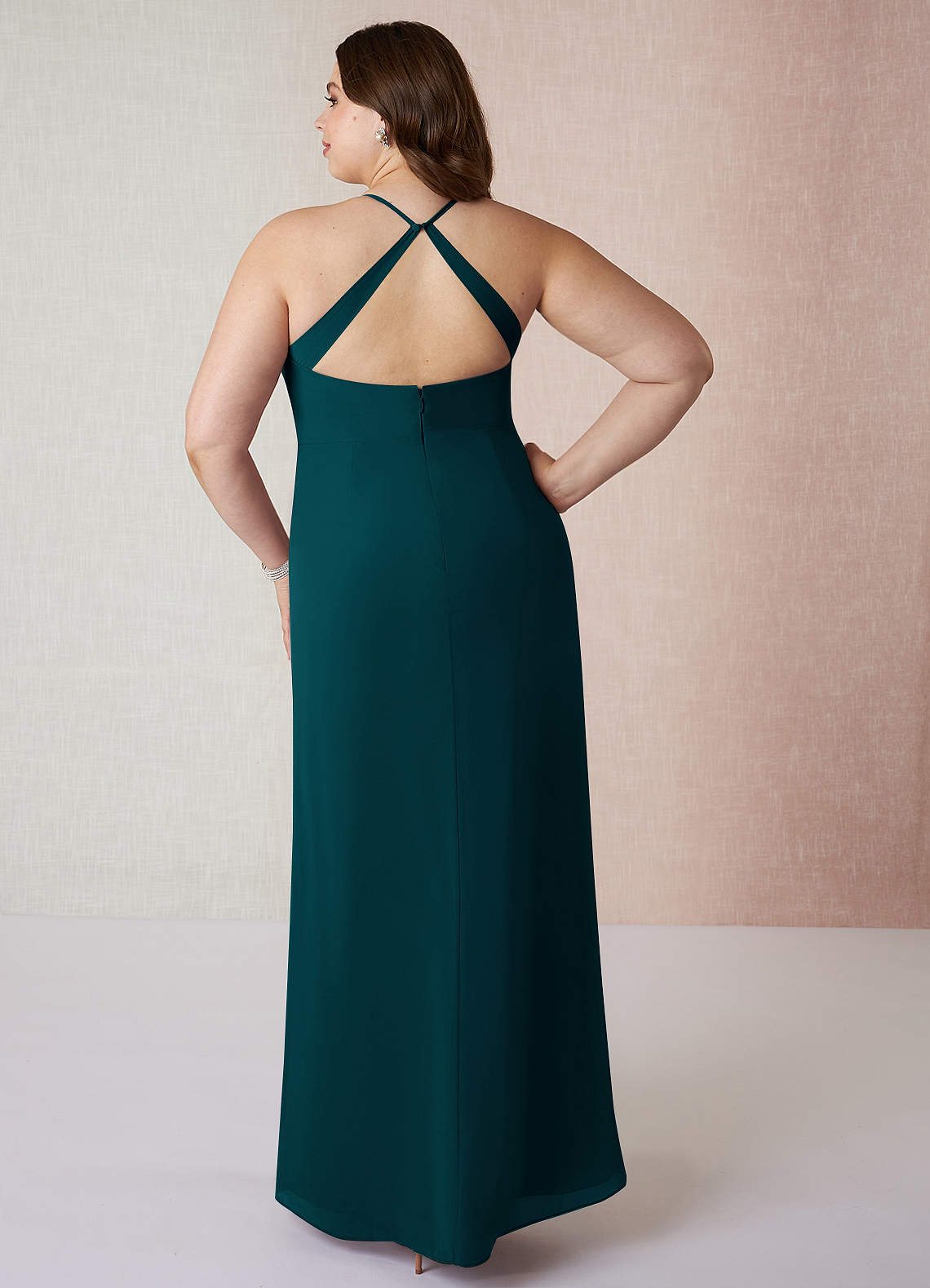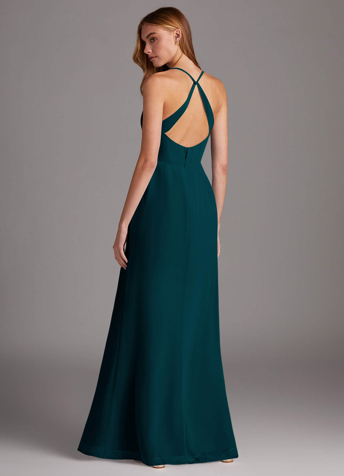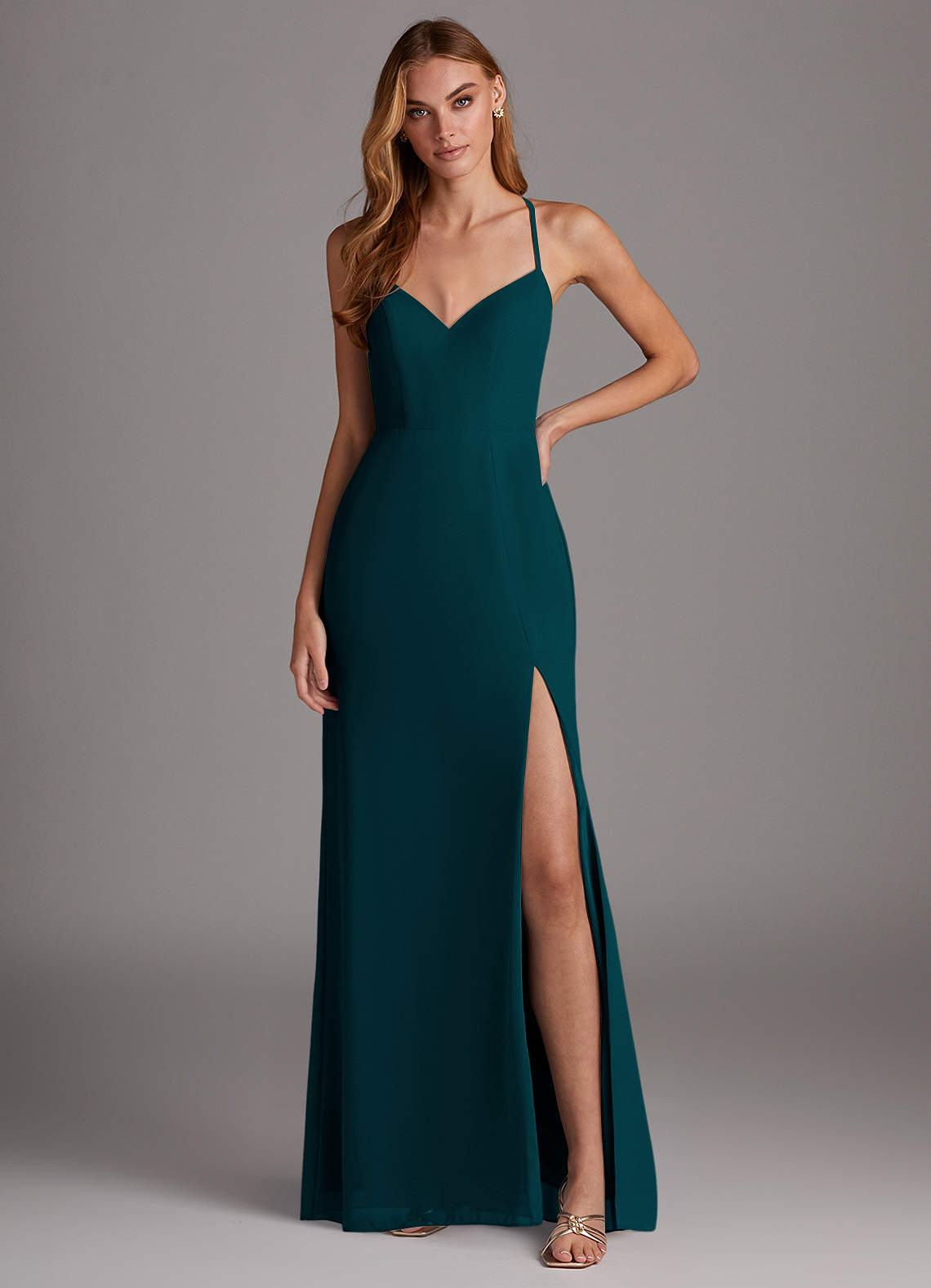 Manila is our lovely bridesmaid dress cut from chiffon. She features a V-neckline with spaghetti straps that lead to an open keyhole back. The look is complete with a floor length mermaid skirt and leg slit.