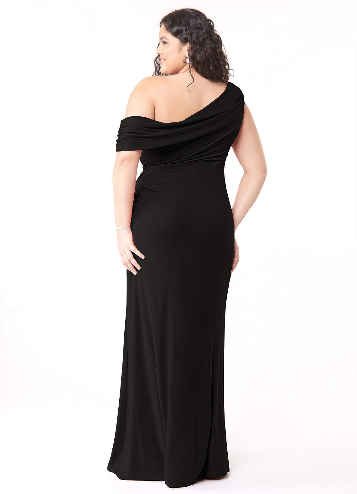 Have your bridal party dressed in elegance with our Luxe Knit column dress, Rorie. Her portrait collar drapes form one shoulder to off shoulder with pleating knot detail at the waist that is perfect for all silhouettes. A leg slit offers beautiful movement with every step.