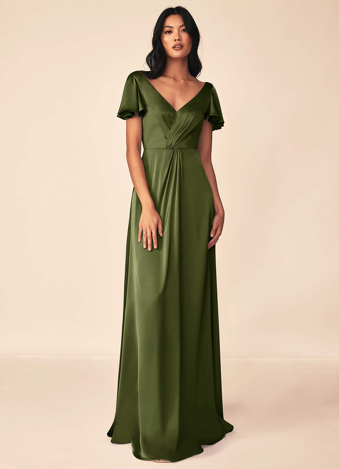 Look elegant and youthful while wearing our Soren dress. Made from our luxurious stretch satin, this bridesmaid dress features a V-neckline bodice with delicate flutter sleeves and a pleated twist detail. Her full length, A-line skirt makes this dress sophisticated and comfortable.