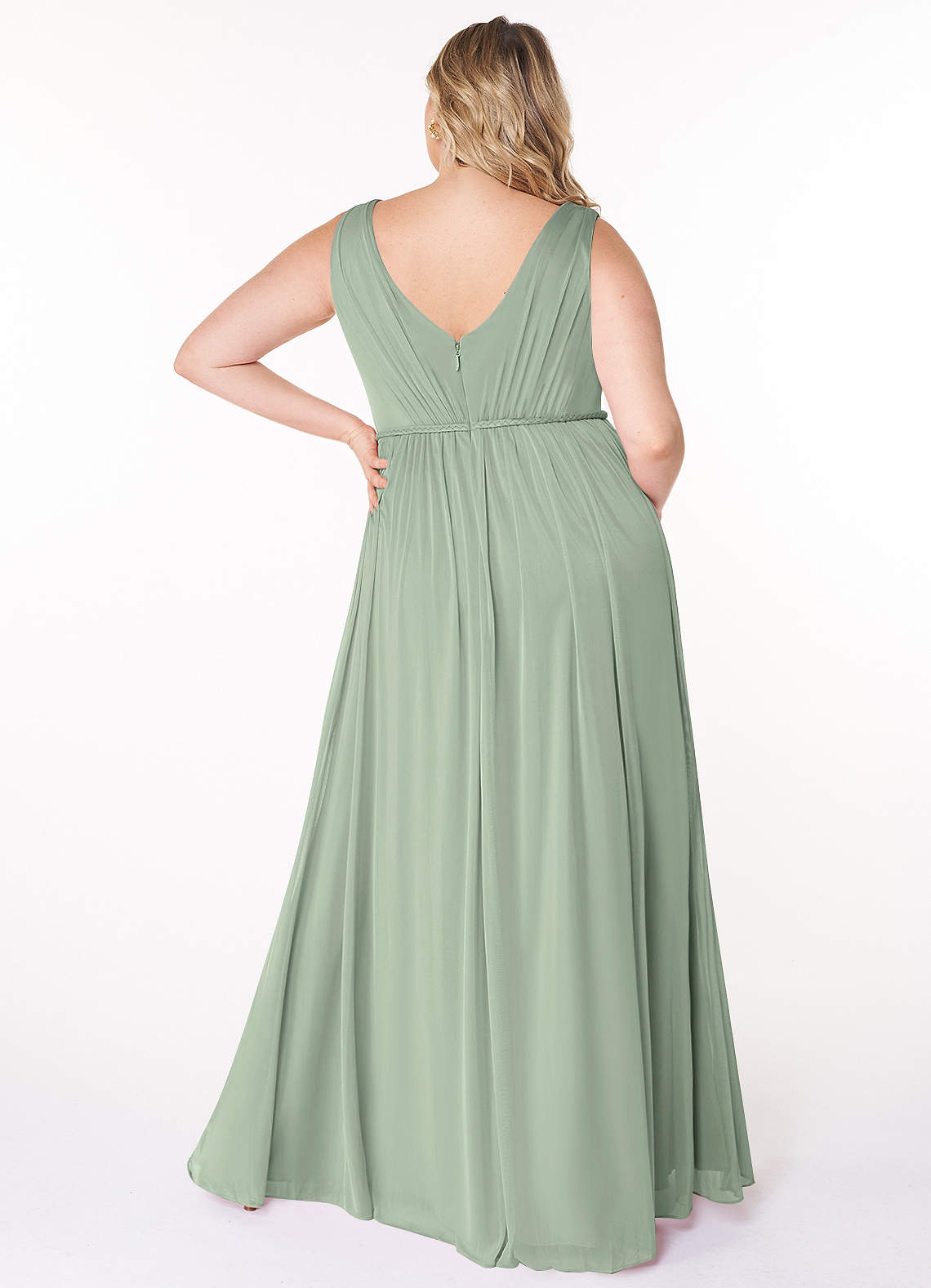 Tanicia is a beautiful bridesmaid dress with an A-line skirt and V-neckline. The waist is accentuated with a braided belt for extra charm. This bridesmaid dress features a side slit to show some leg and a V-shaped back. The bodice and back are strategically pleated, giving this a more polished look.