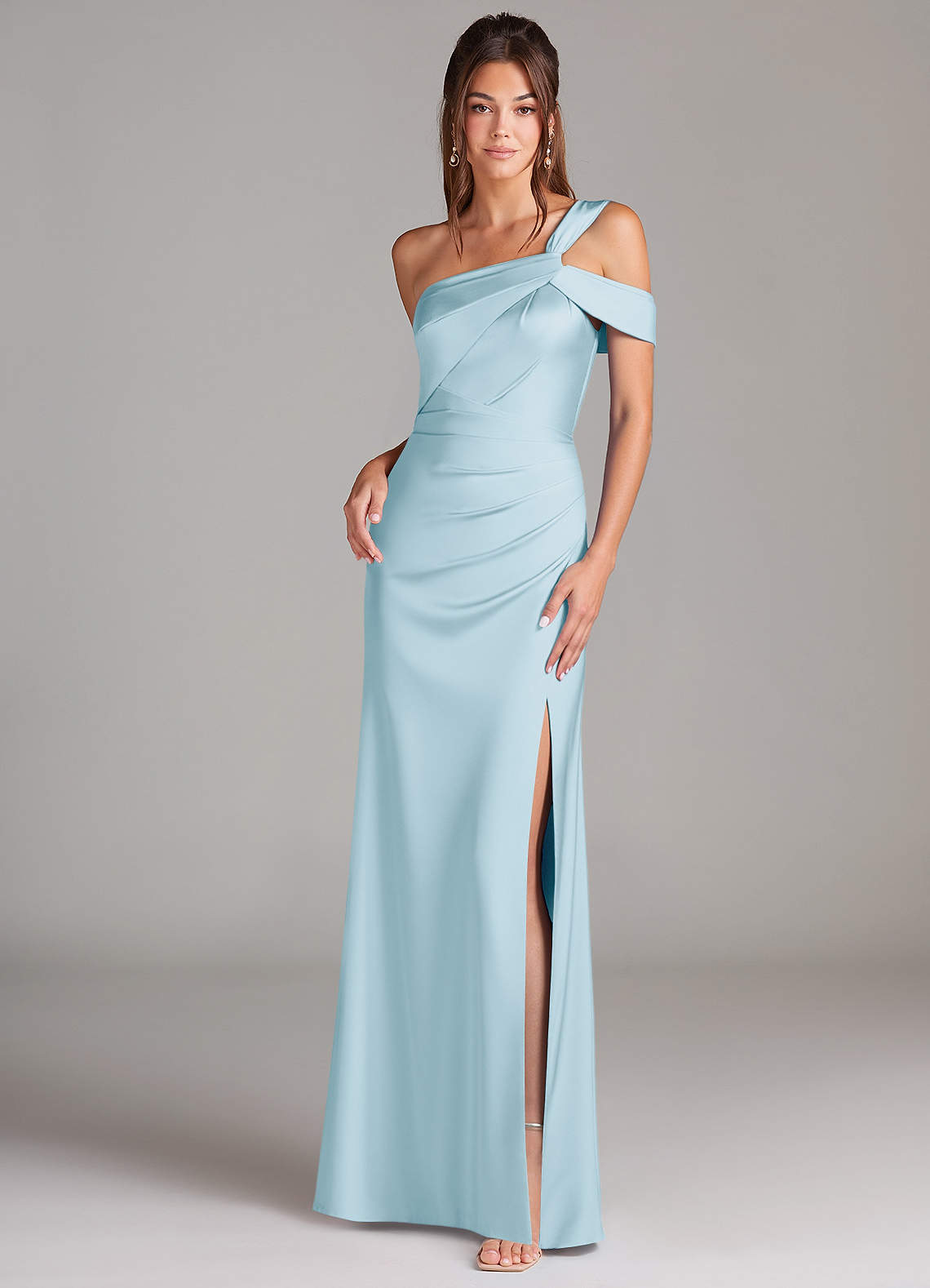 The Wynter bridesmaid dress combines sleek sophistication with a touch of drama. Featuring a one-shoulder design with double straps, side pleating, and a daring leg slit, this stretch satin sheath exudes effortless elegance.