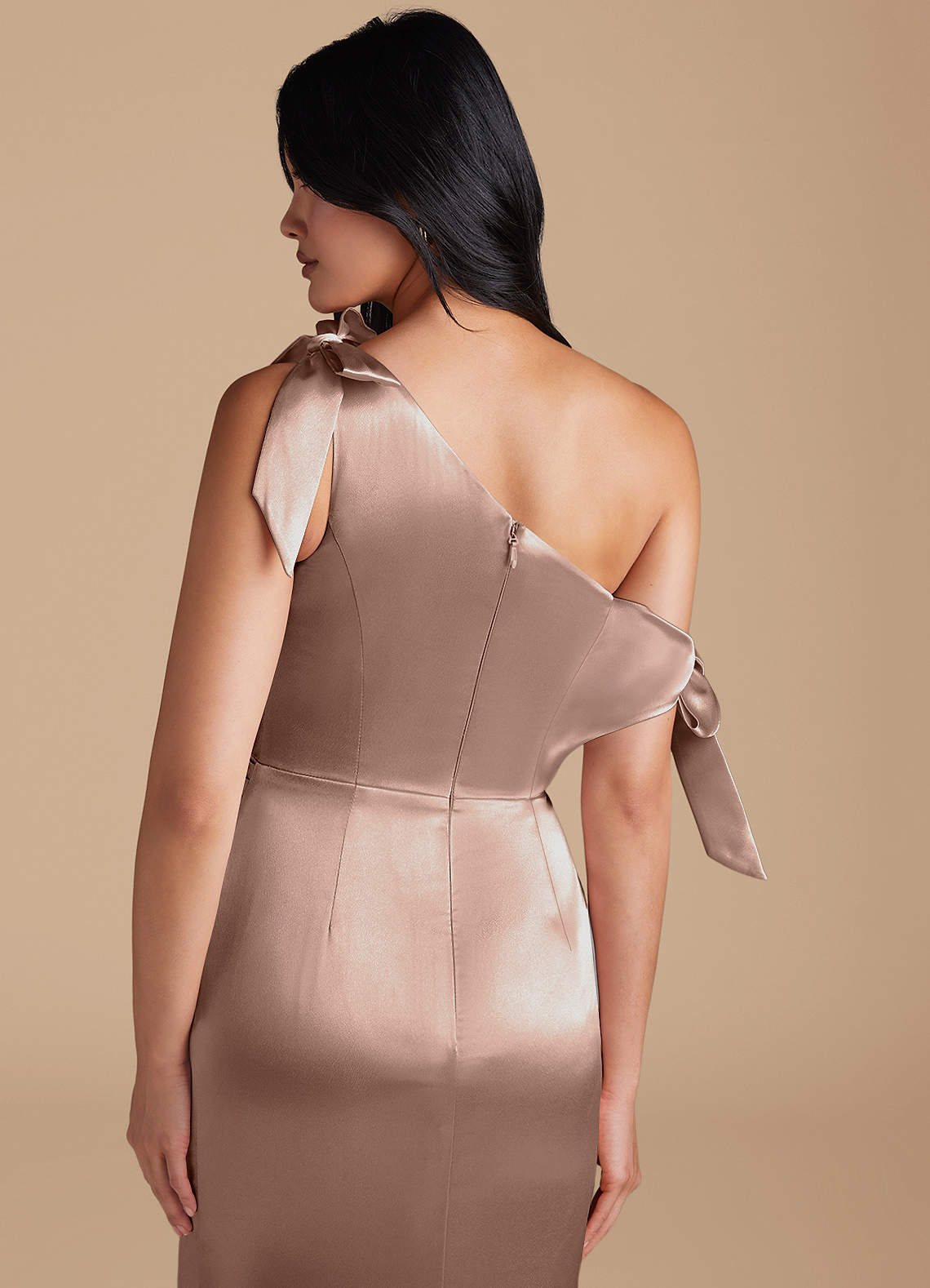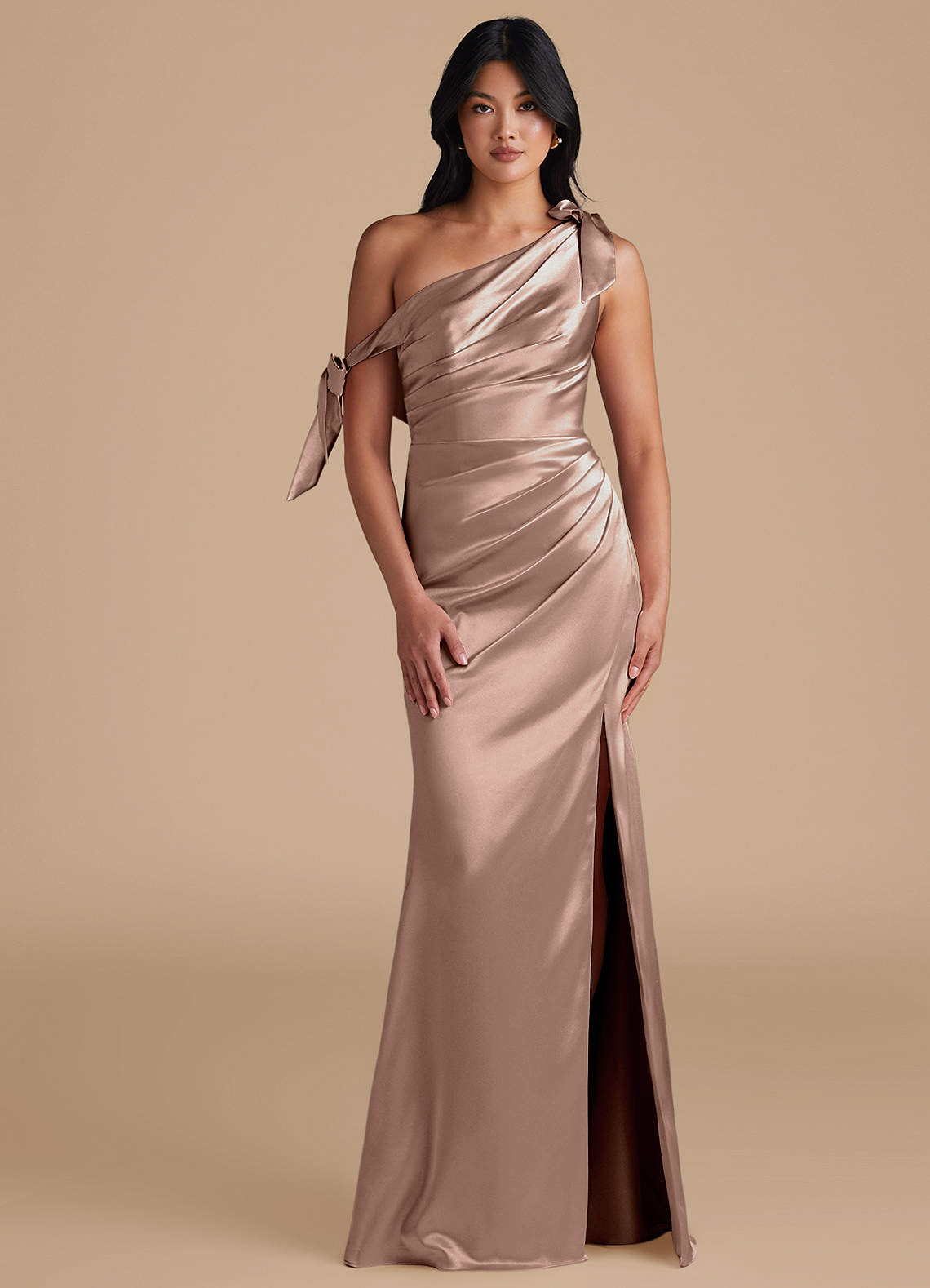 Xyla is perfect for every bridesmaids wanting a sophisticated look. Cut from our metallic satin in our sleek sheath silhouette, she has a one-shoulder neckline with charming bow details. Delicate pleating across the bodice and skirt adds texture and refinement. A daring leg slit completes the look, offering a striking balance of modern style and graceful femininity.
