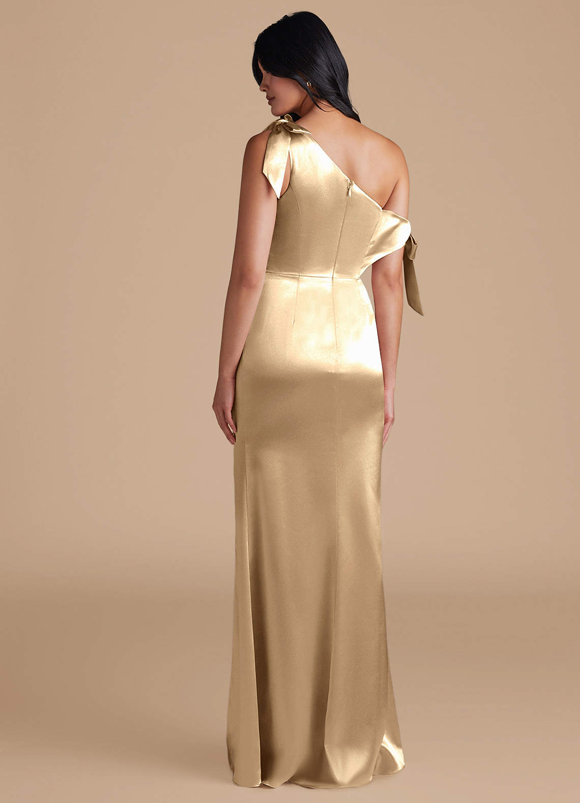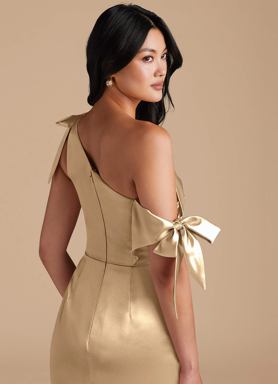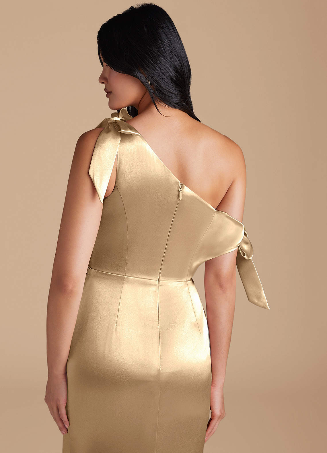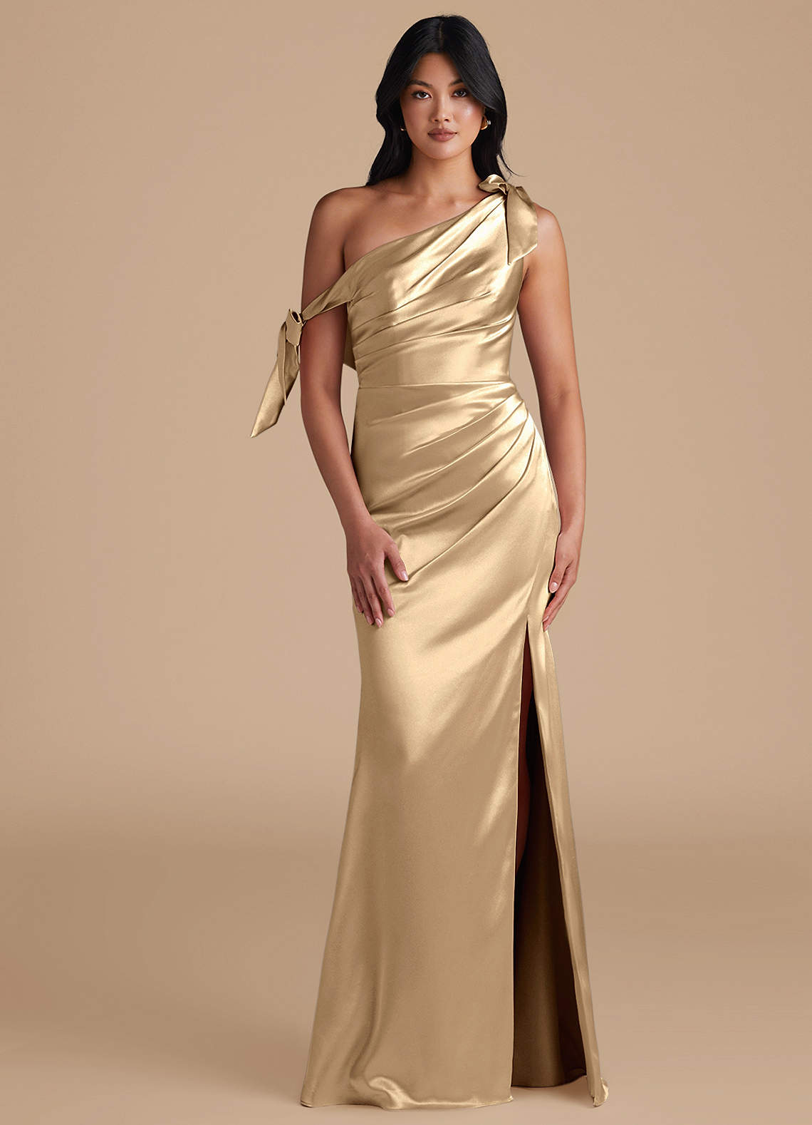Xyla is perfect for every bridesmaids wanting a sophisticated look. Cut from our metallic satin in our sleek sheath silhouette, she has a one-shoulder neckline with charming bow details. Delicate pleating across the bodice and skirt adds texture and refinement. A daring leg slit completes the look, offering a striking balance of modern style and graceful femininity.