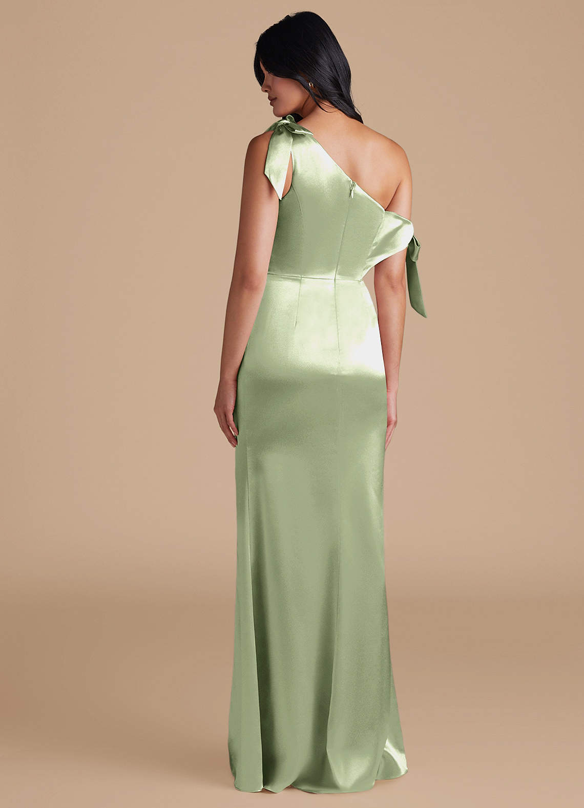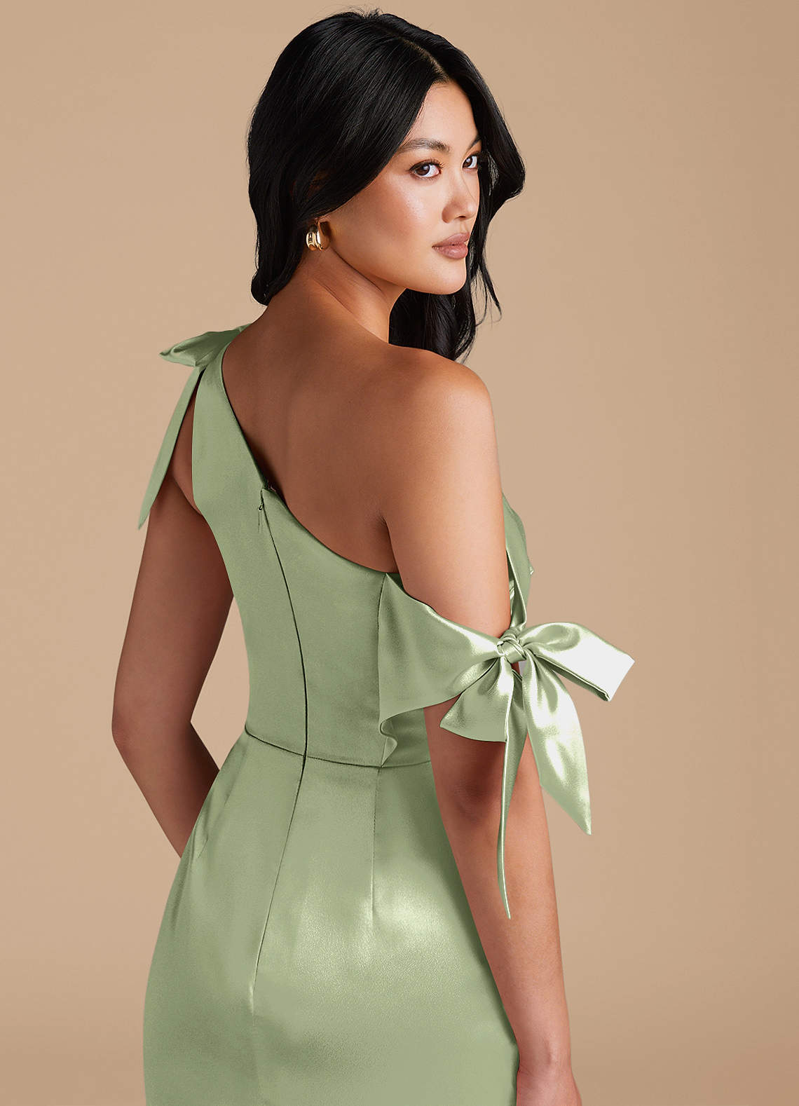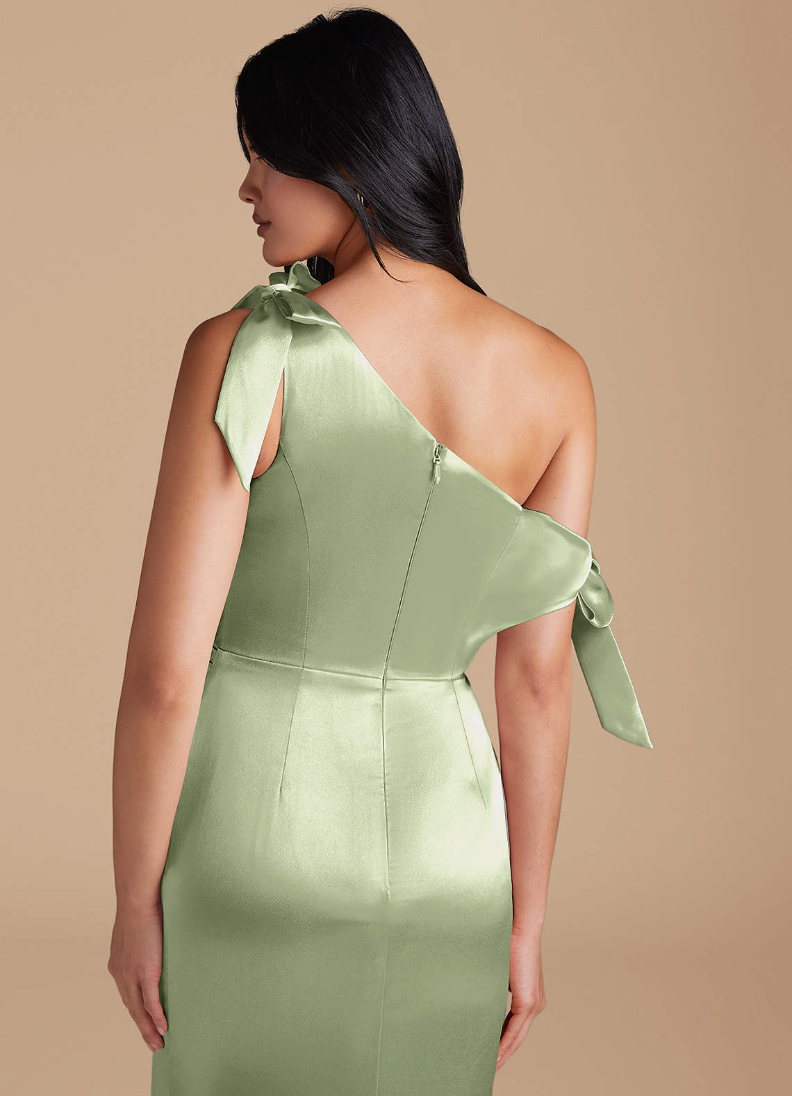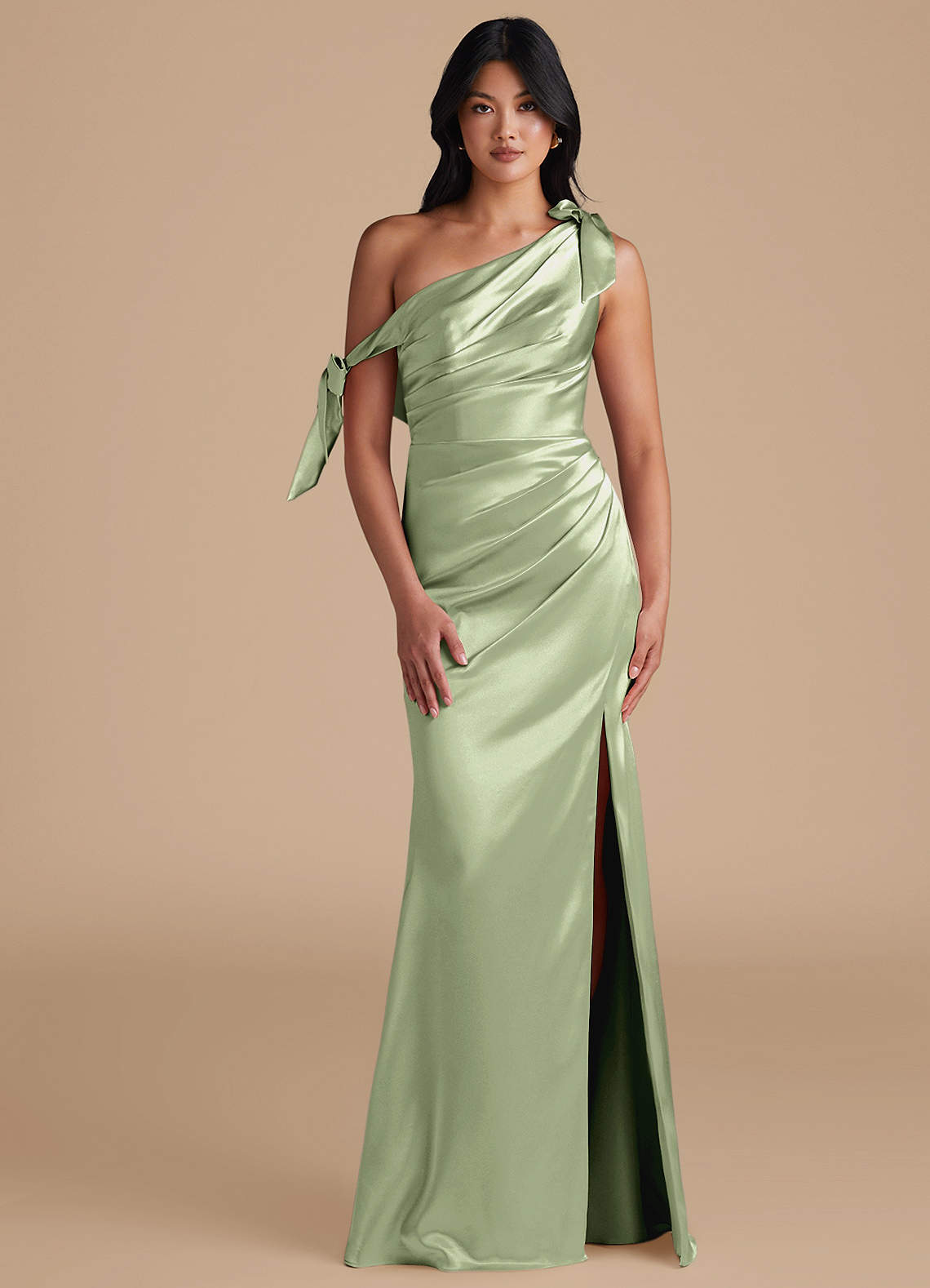 Xyla is perfect for every bridesmaids wanting a sophisticated look. Cut from our metallic satin in our sleek sheath silhouette, she has a one-shoulder neckline with charming bow details. Delicate pleating across the bodice and skirt adds texture and refinement. A daring leg slit completes the look, offering a striking balance of modern style and graceful femininity.
