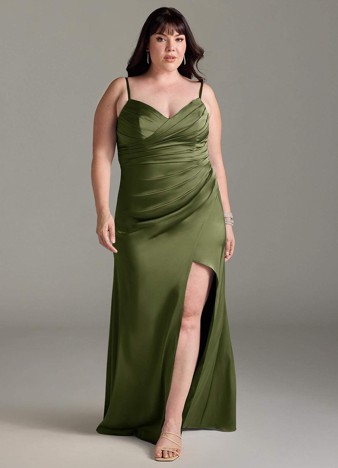 Have your bridesmaids cinched to perfection while they wear our stretch satin mermaid bridesmaid dress, Yola. Her v-neckline has pleats made to cinch the waist while sitting atop delicate pleats that open to a leg slit.